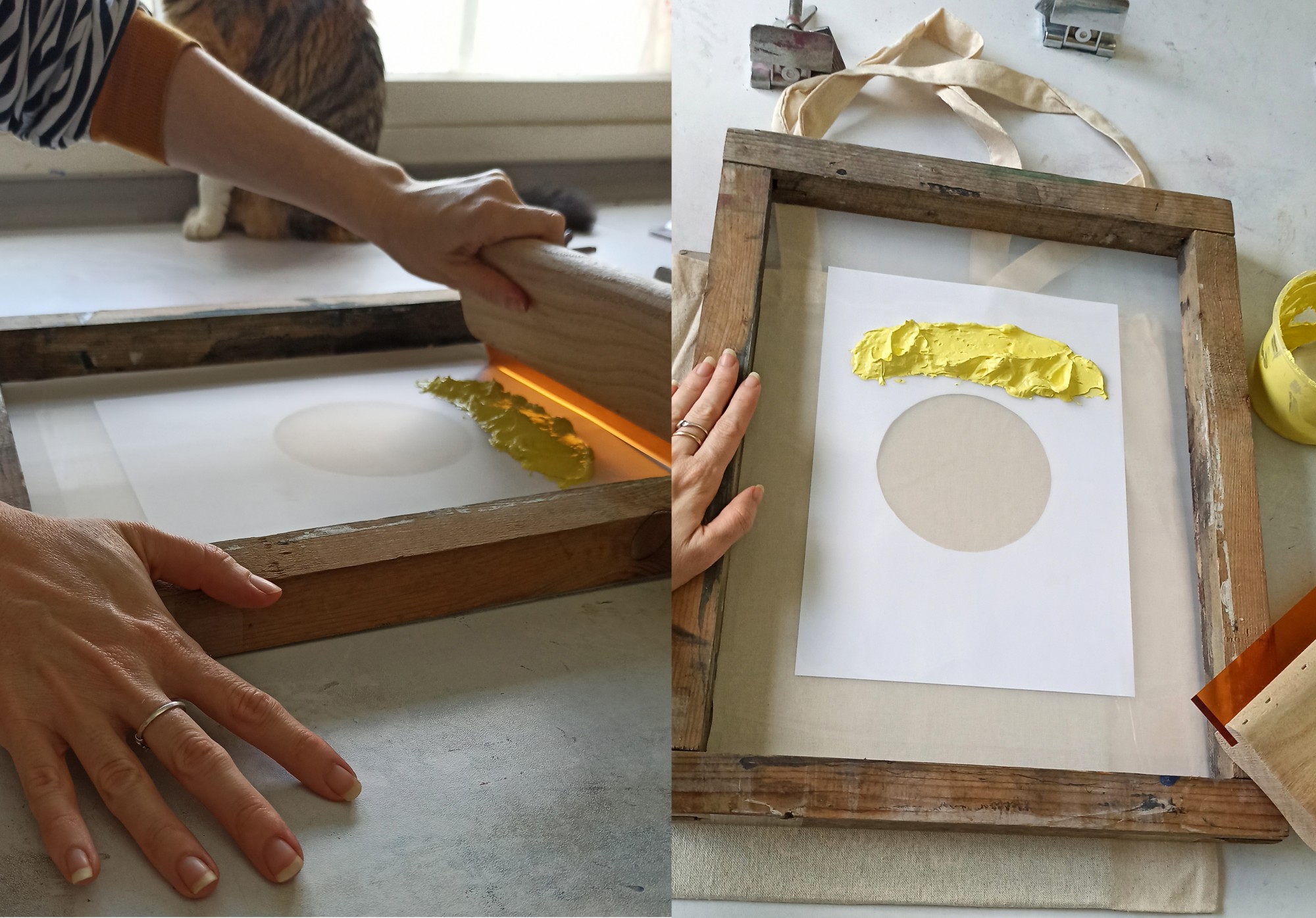 When the stencil is attached to the screen and the bag is ready with the cardboard inside, you can place the screen on top of the bag with its flat side towards the bag and the side where the frame protrudes upwards.