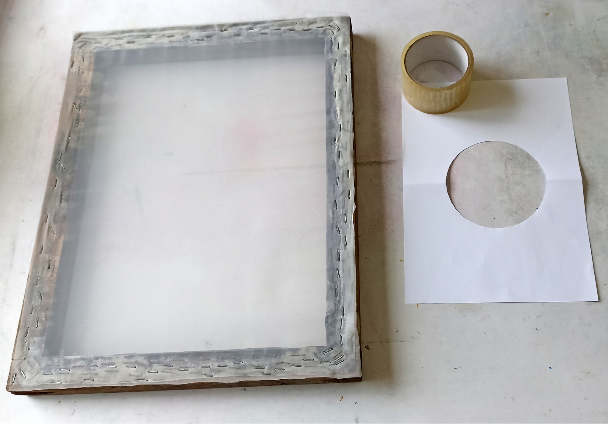 We will use a dedicated printing screen to print the stencil on the fabric. The paper must be placed in the center of the screen on its flat side (not on the side where the frame outstand). We will take the tape and use it to stick the template to the screen.