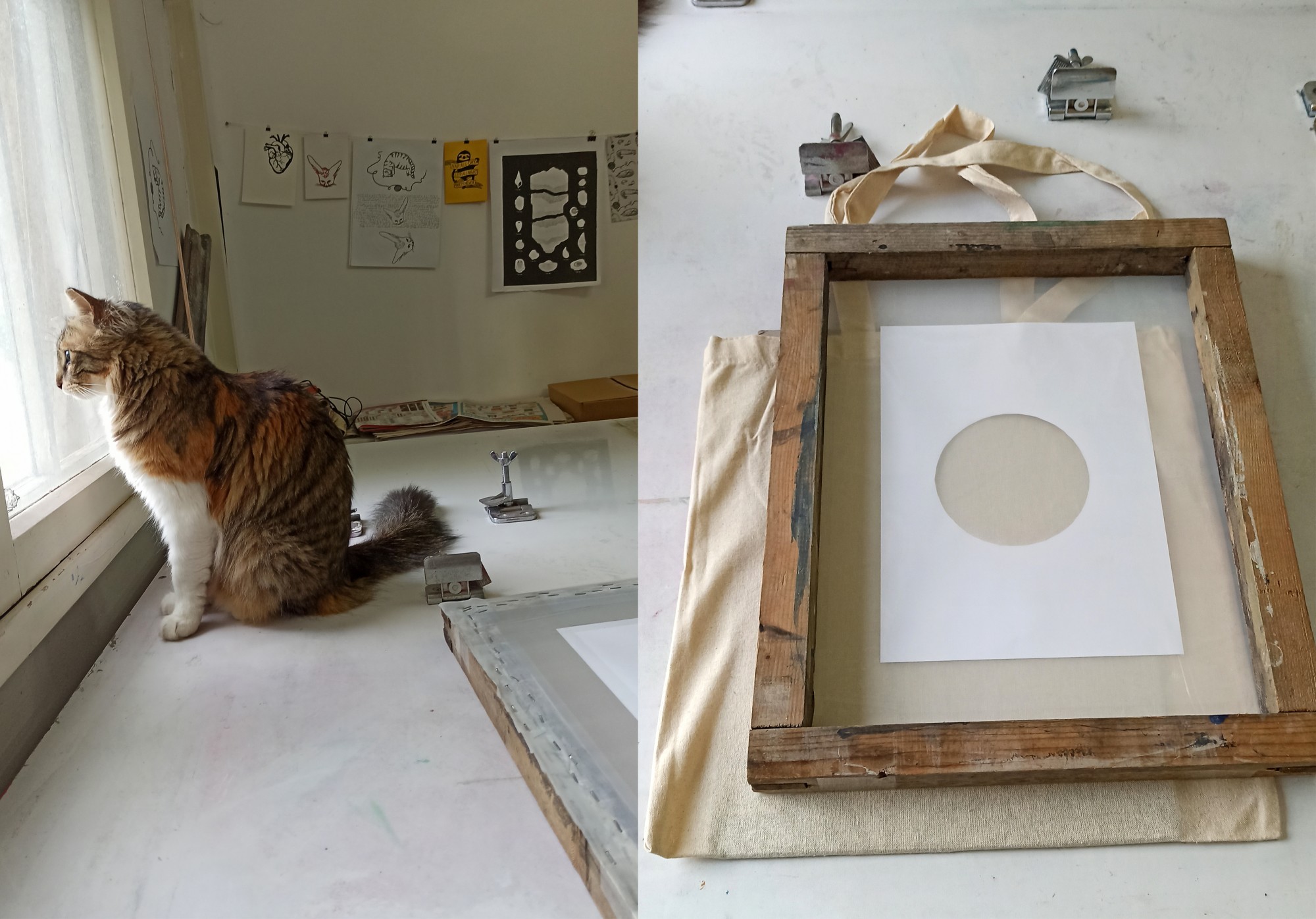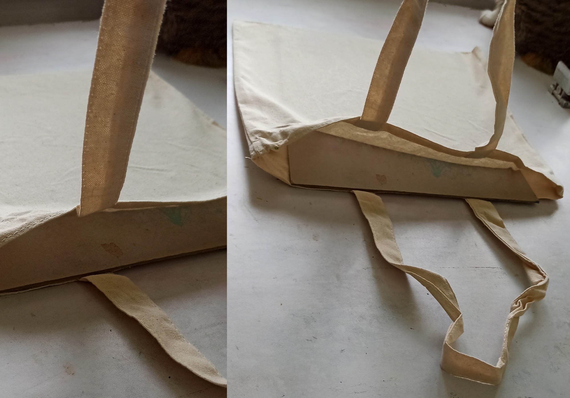 The screen is ready for printing, now all that remains is to prepare the bag on which I wanted to print. In screen printing, a large amount of ink is press through the mash when printing on fabrics. Therefore, when printing on a shirt, bag, pillowcase (and any other item with two layers of fabric sewn together), cardboard or newspaper must be placed between them so that the color does not accidentally reach the other side of the item.