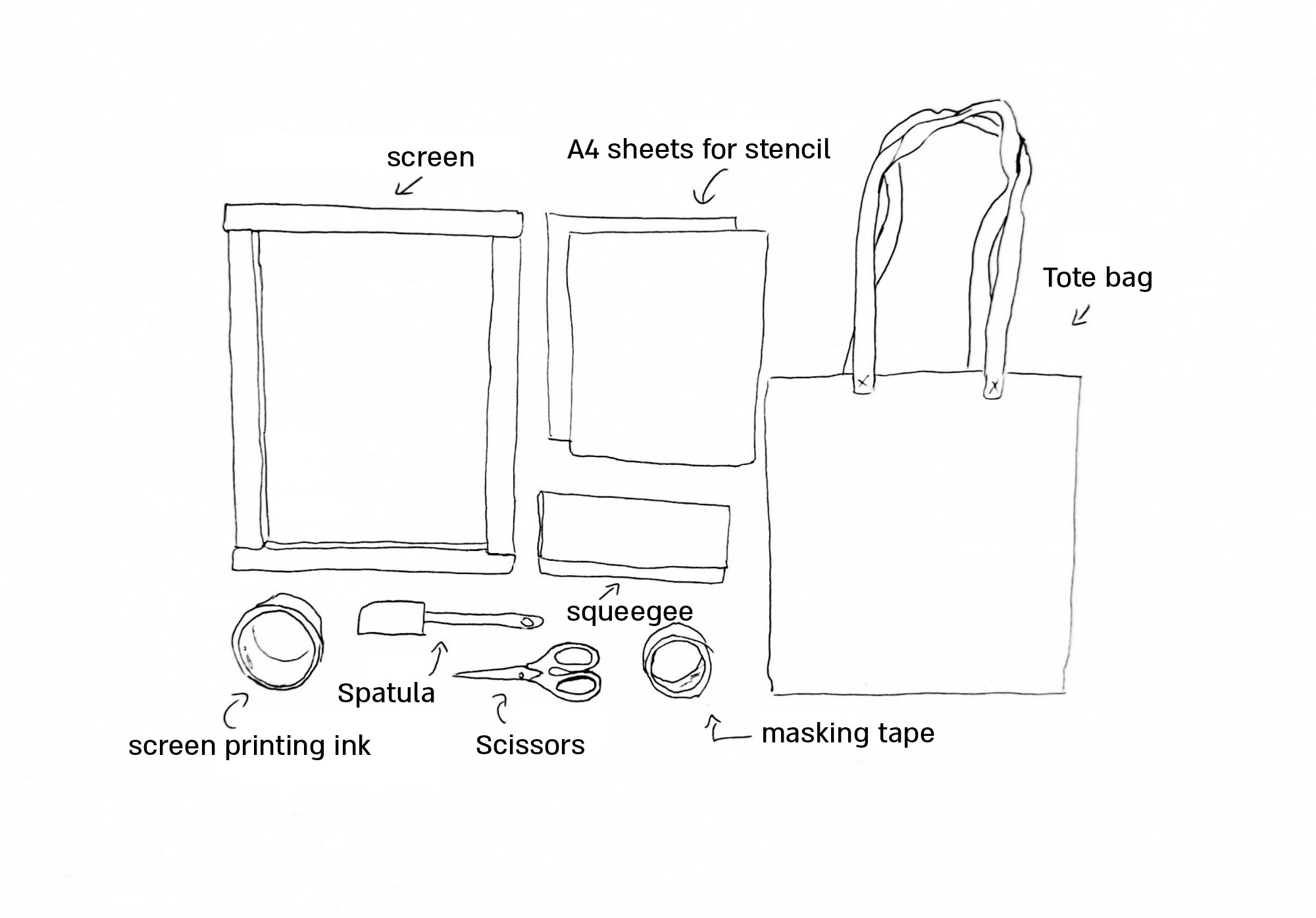And all what you have in your kit: screen, squeegee, screen printing ink, sheets for stencil and masking tape.