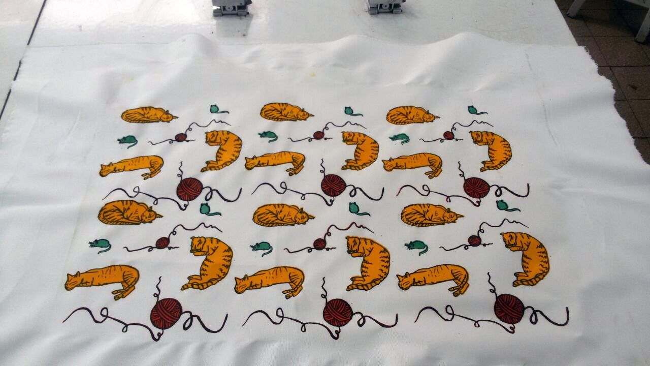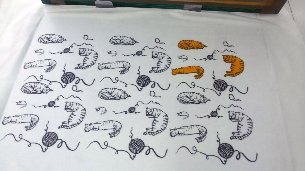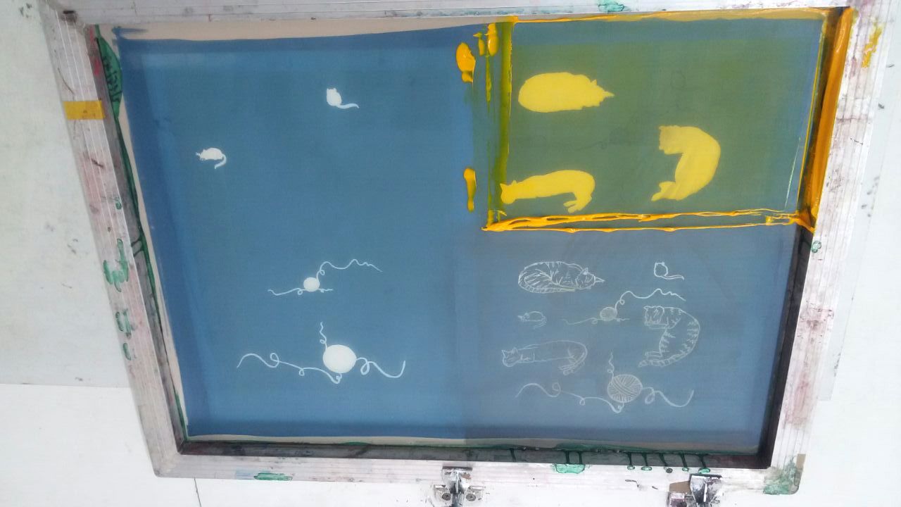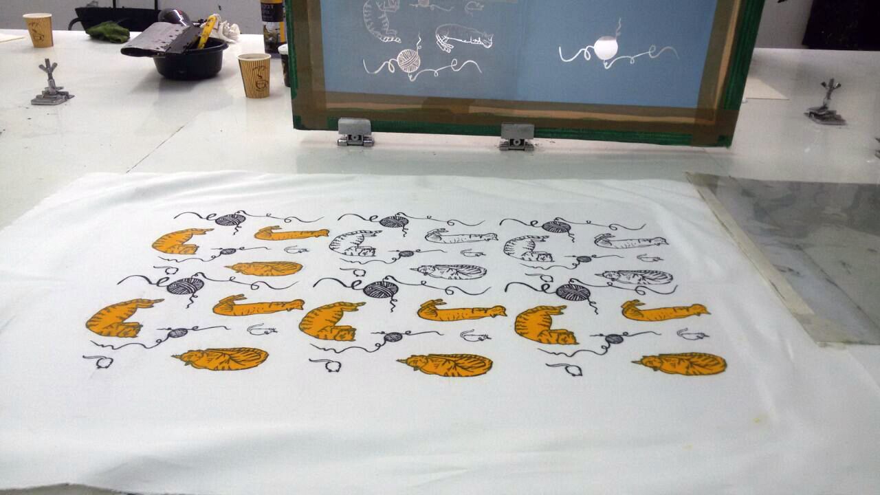This is why, when I finally figured out that patterns and prints are what I love, I did not want to compromise: I started learning how to be a screen printer and created a colorful pattern to print with my favorite color and animal: An amber cat (btw Amber is also my name). It was not easy - but I enjoyed every moment. In the end it become a 4 color print of a repeated pattern. I started it by drawing some illustrations of cats, mice and wool.