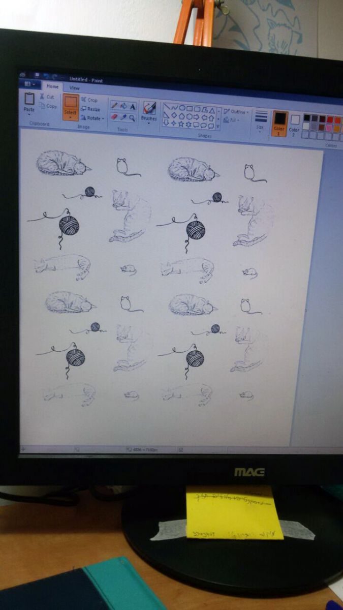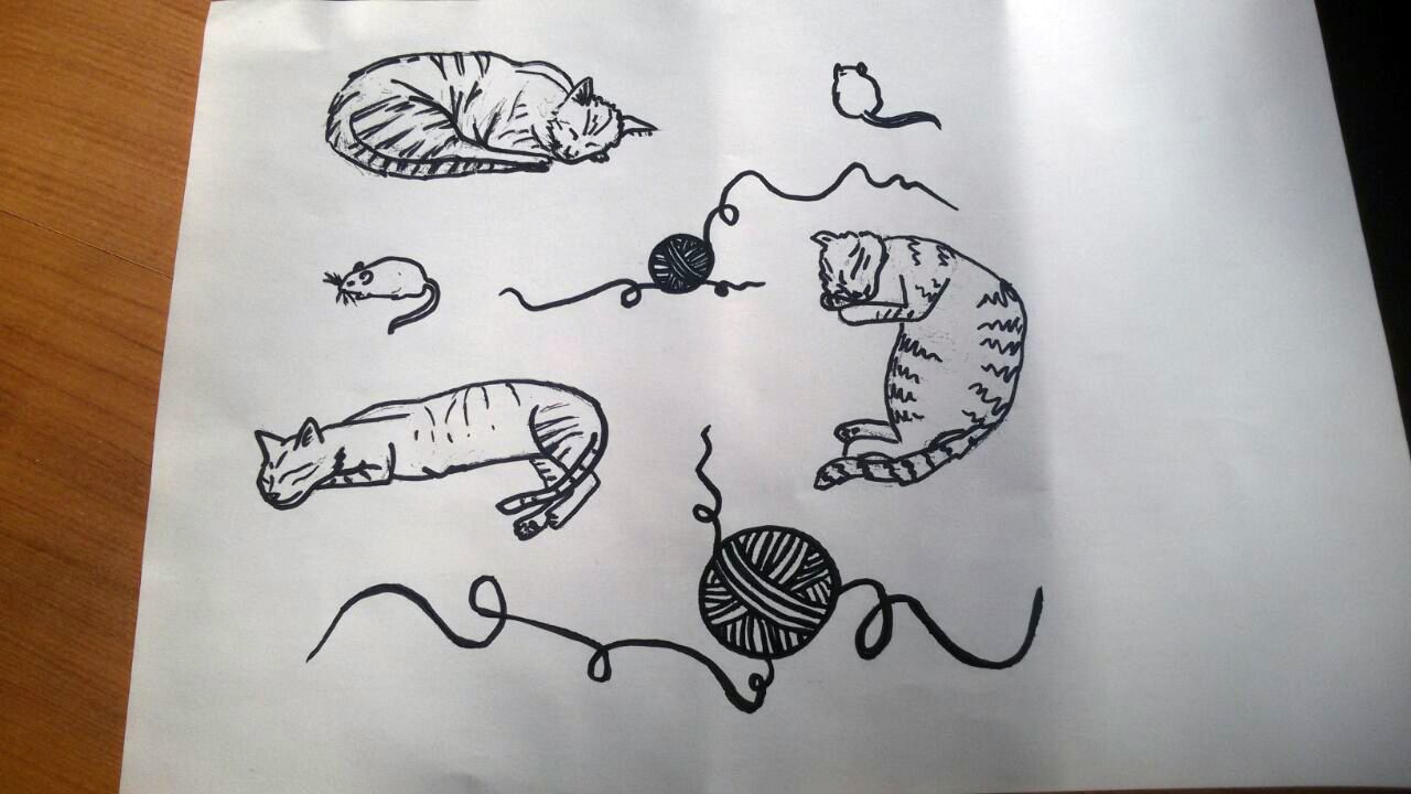 Then, additional to the contour I've already drew, to make a 4 color print I needed to create shadows of cats, mice and wool so each item in my illustration would have its own color eventually.