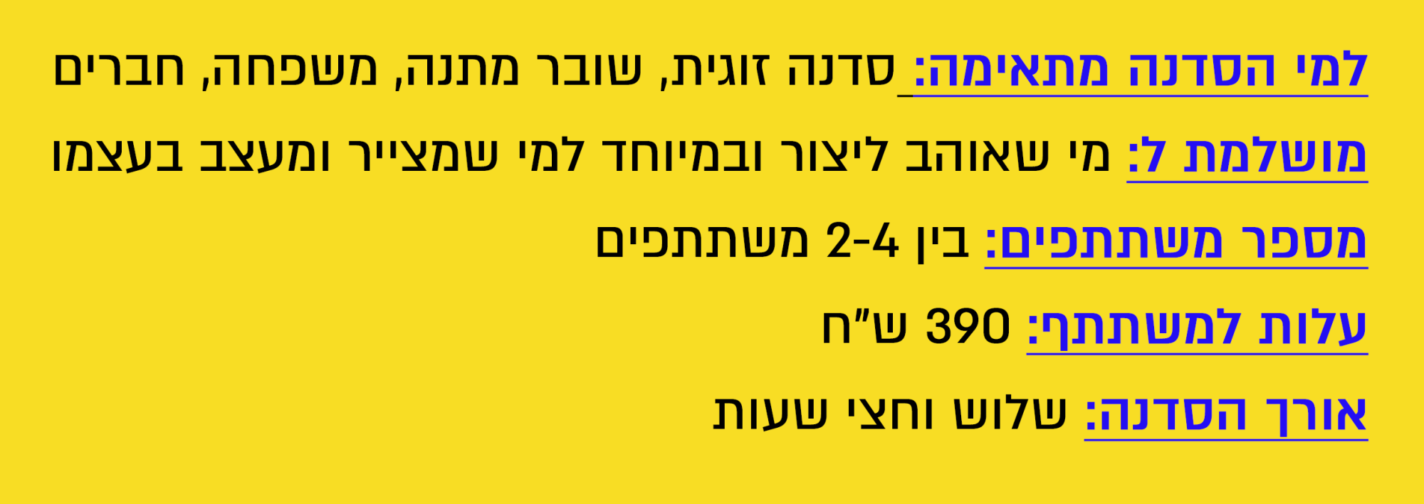 המחיר הוא למשתתף בסדנה של עד 4 משתתפים.