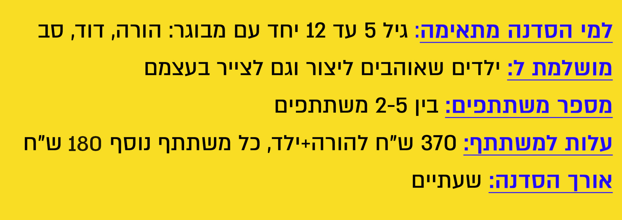 מחיר סדנה לילד+הורה מלווה הוא 370 ש"ח.
