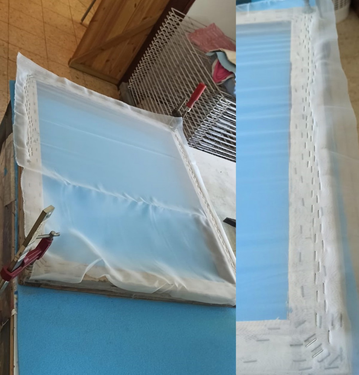 בתמונה פה למטה אפשר לראות שבצד שמאל של הרשת כבר חיברתי סיכות, קרוב לפינה ולכן הבד שם מתוח ויפה ללא פסים.