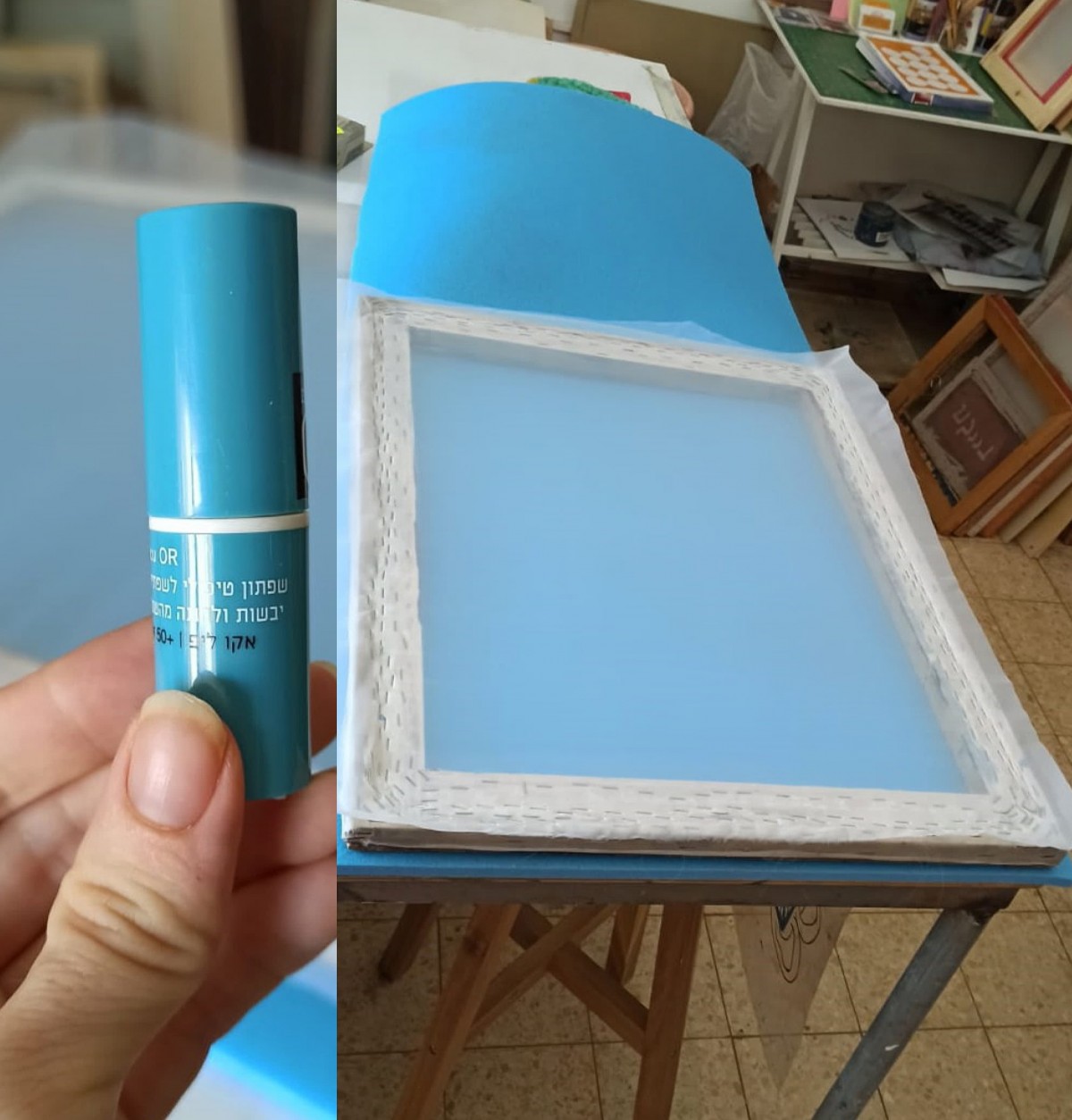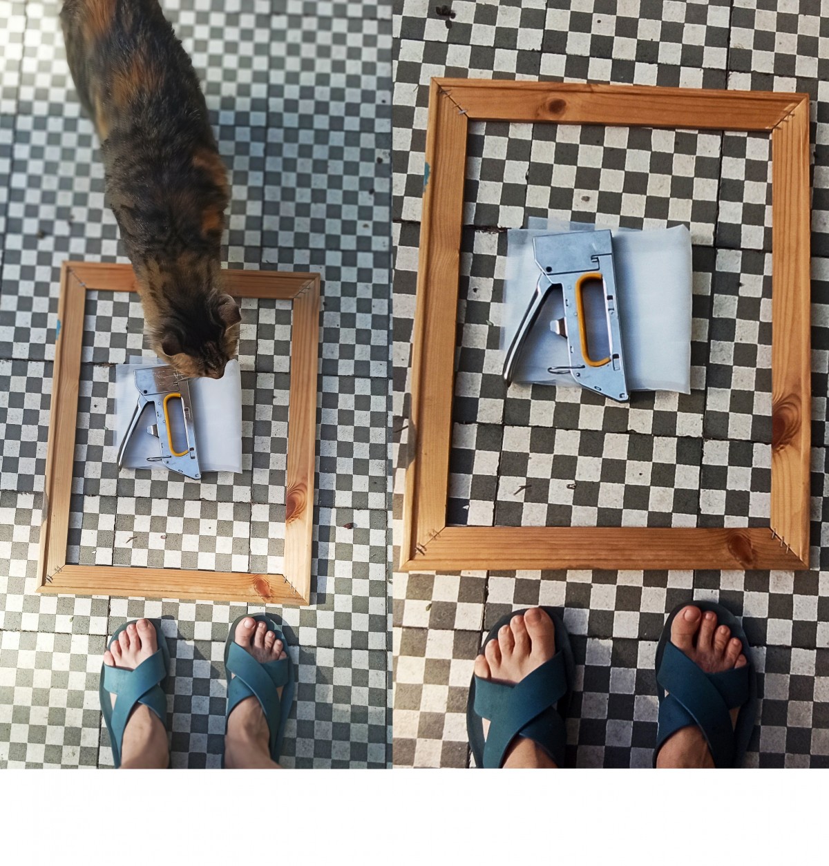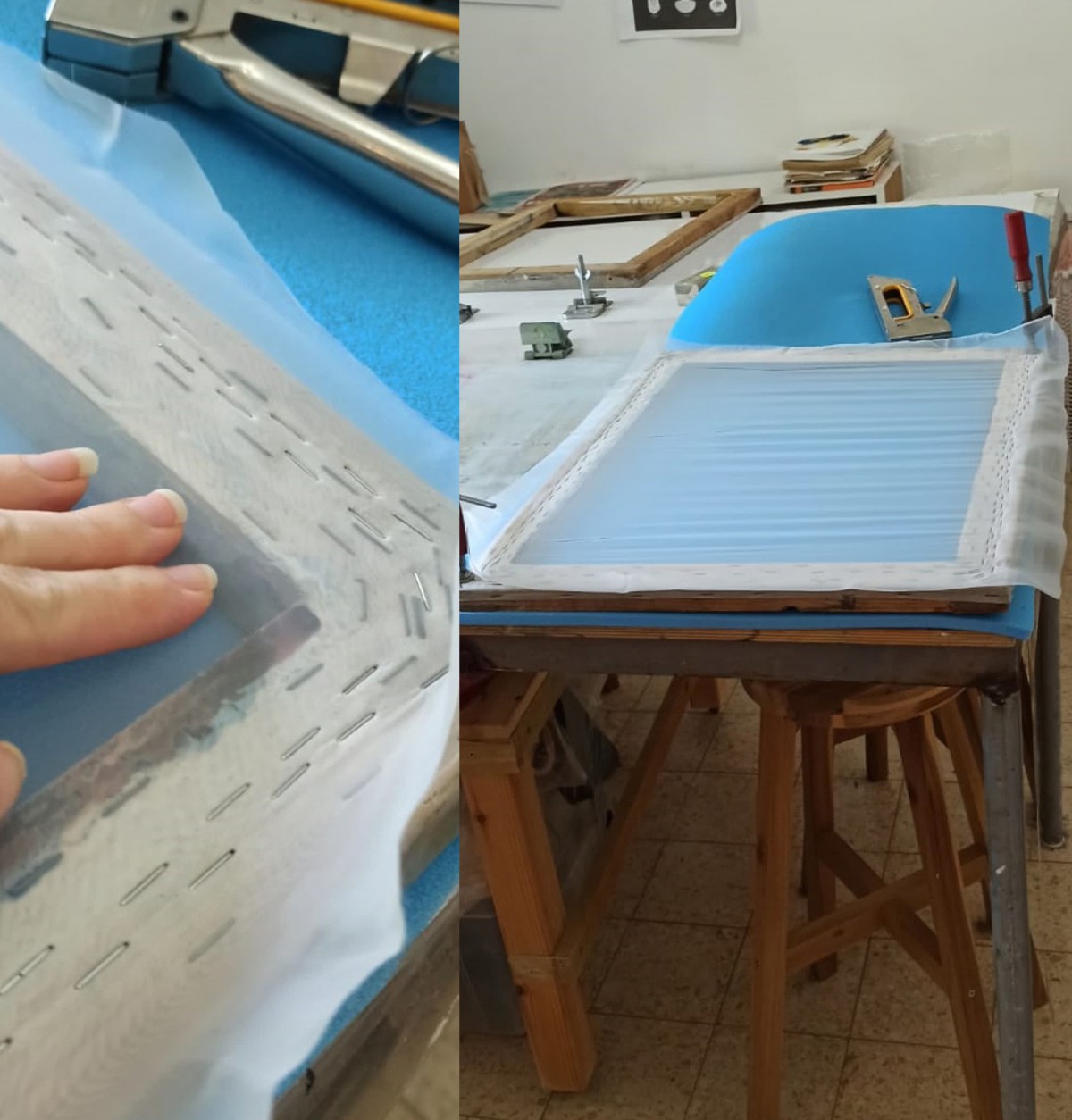 יד אחת מותחת את הבד והיד השנייה משדכת אותו למסגרת בעזרת האקדח.