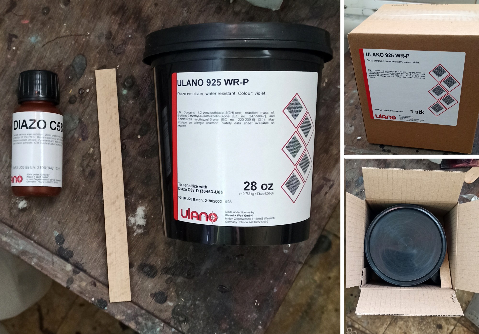 אמולסיה מגיעה בשני חלקים. כשתפתחו את הקופסה שלה יהיו בה מיכל שחור גדול, בקבוקון ומקל ארטיק. את החומר שבבקבוקון (דיאזו או "מרגש" בעברית), אבקה רגישה לאור, ואת החומר שבמיכל (מין דבק שנקרה אמולסיה) יש לערבב יחד כדי להפעיל את האמולסיה ולהפוך אותה לרגישה לאור, מה שחשוב מאוד לתהליך הכנת רשת הדפס.