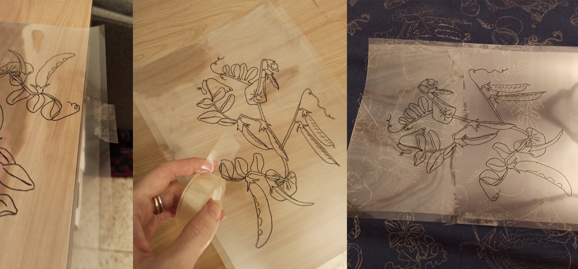 בגלל שזו שכבה שנייה של הדפס שונה על אותו תיק ואני רוצה למקם ביחס לתיק וביחס להדפס הקודם שנמצא על התיק, אני נעזרת בשקף שהדפסתי בשלב 4 ששימש אותי להקרנת הרשת בשולחן האור. אני ממקמת אותו על התיק בדיוק במקום בו ארצה להדפיס את אפונת השלג שלי.