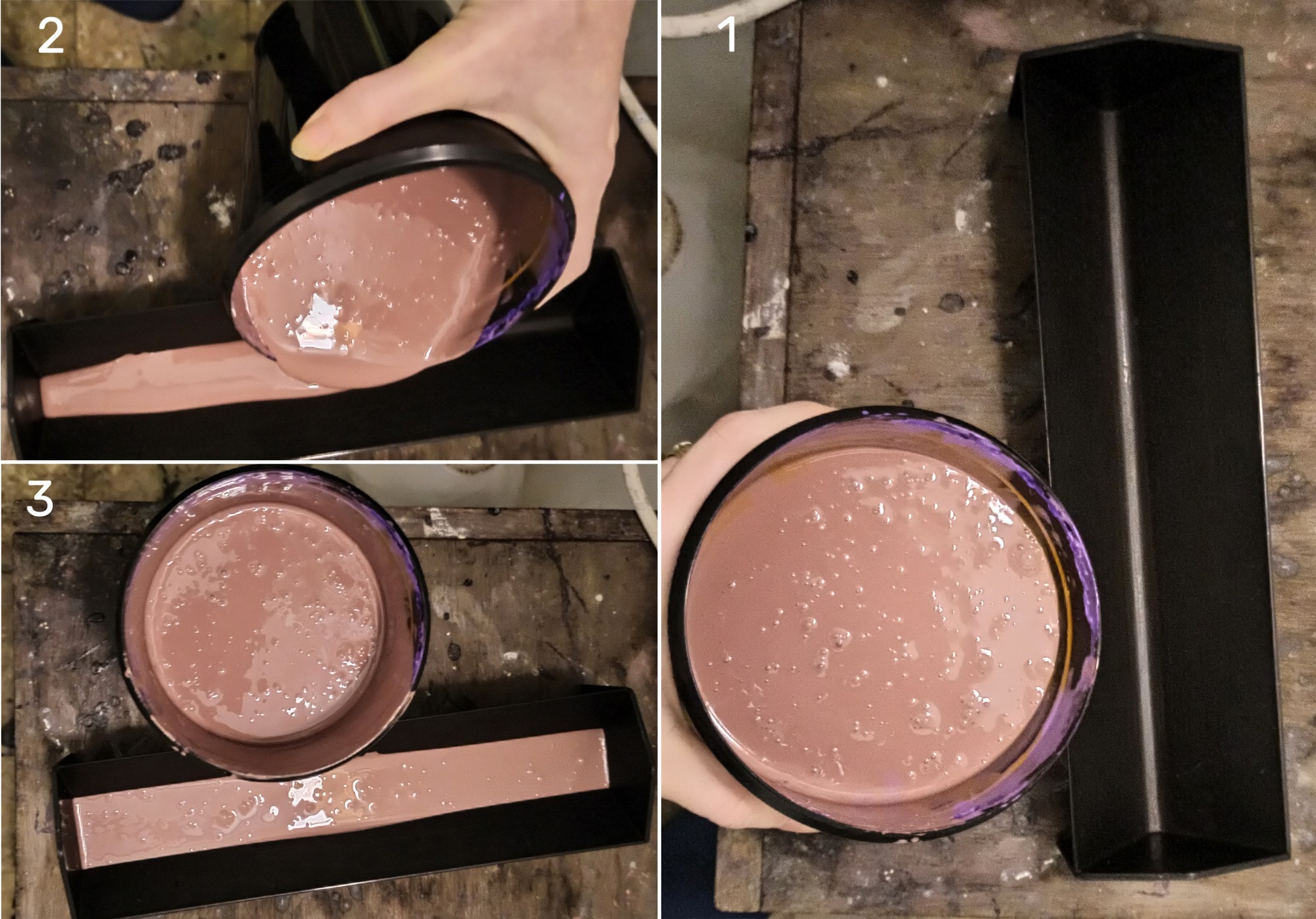 יש להעביר כמות נאה של אמולסיה לכף, פשוט על ידי מזיגה מהכלי אל תוך הכף כמו בתמונות. יש למלא את הכף בין שליש לחצי מהגובה שלה. כשתסיימו יהיו כמה טיפות של אמולסיה שנזלו מהכלי, אני מנגבת אותן עם מקל הארטיק איתו ערבבתי.