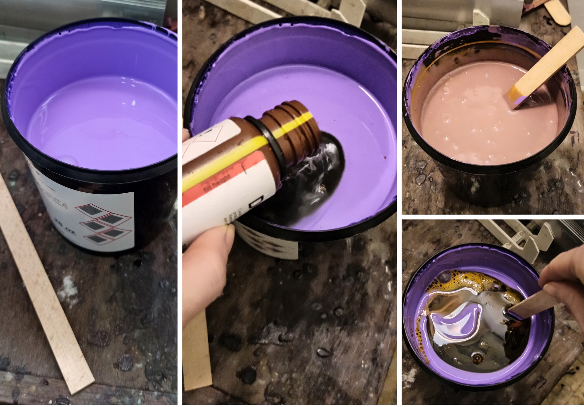 זוכרים שהאמולסיה רגישה לאור? בגלל זה עבדנו איתה עד כה בחדרים סגורים וחשוכים (ד"א התמונות הבאות צולמו בחדר חשוך ולכן האיכות שלהן לא משהו, אתכן הסליחה). התכונה הזו מאפשרת לנו לשלוט באילו חלקים האמולסיה תיחשף לאור ואילו לא על ידי שימוש באור מבוקר ובצבע שחור אטום לאור.