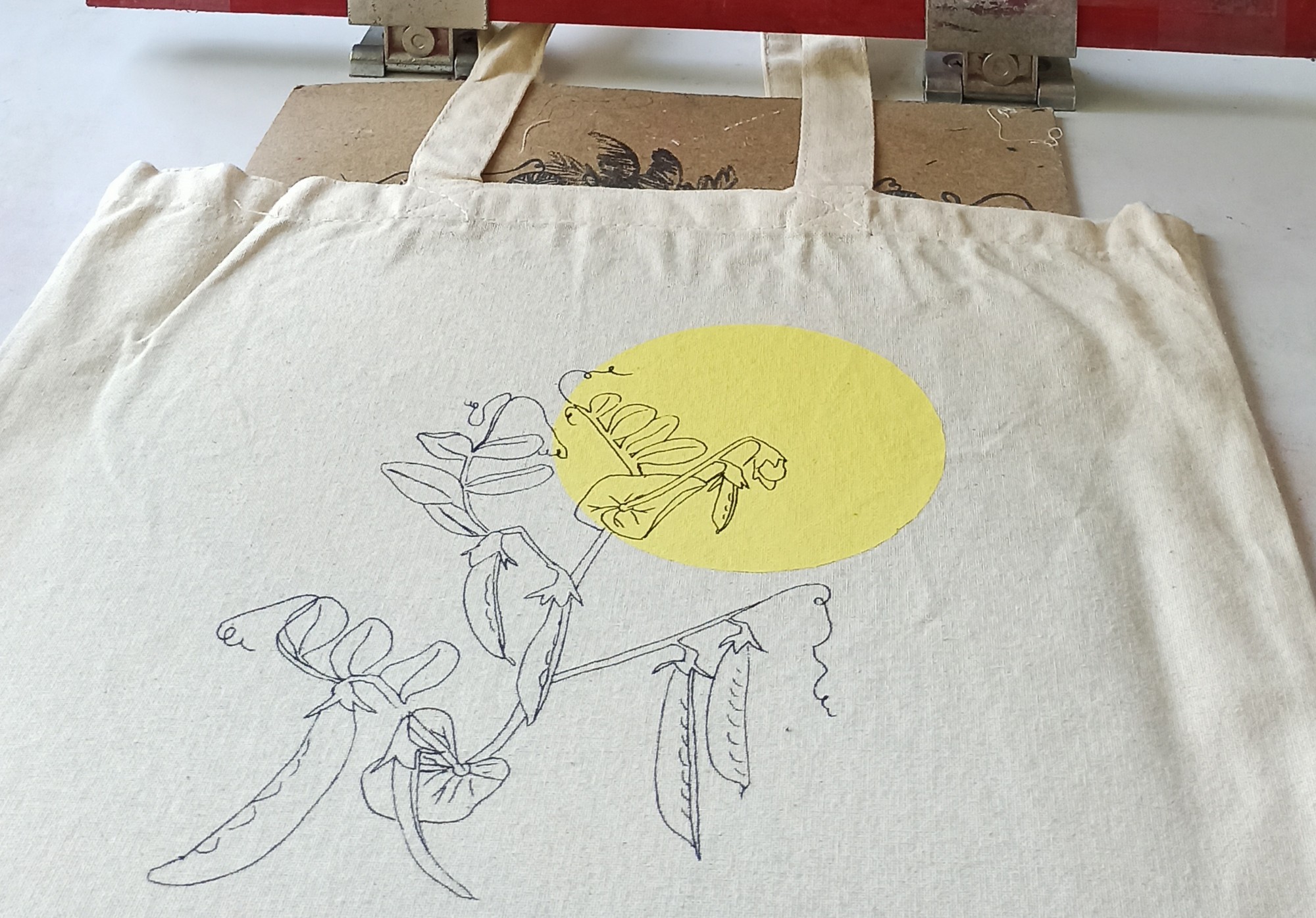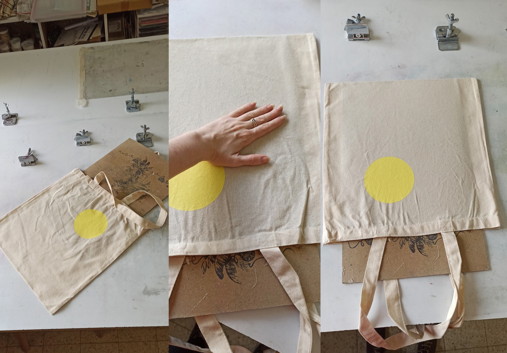 אני בחרתי להדגים את ההדפסה כשכבה שנייה על תיק בד שהדפסתי בעבר (אפשר לראות ולקרוא על זה פה).