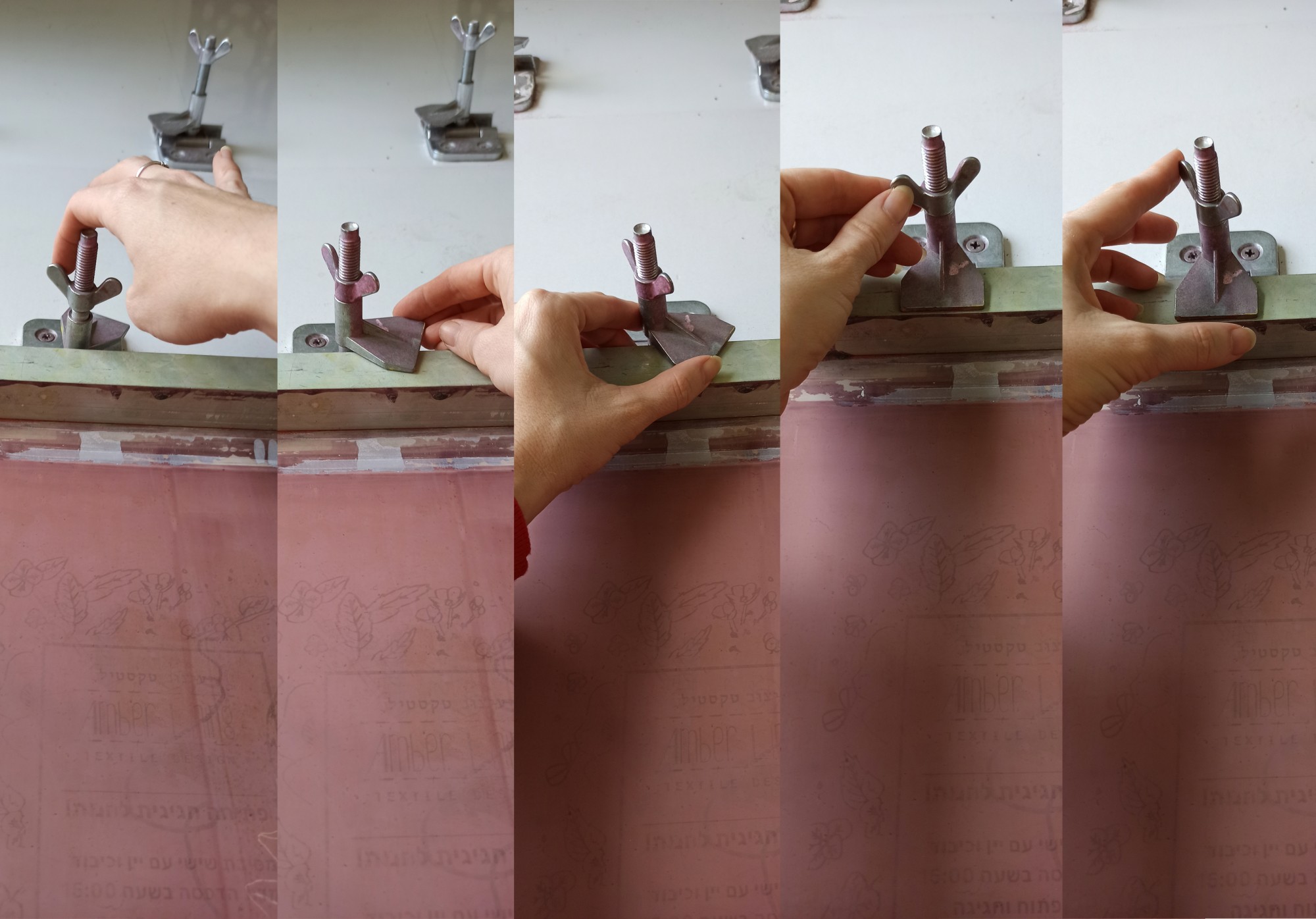 אני משתמשת בתופסנים יעודיים להדפס רשת שהם בעצם שילוב של קליבה וזוית. תמיד אפשר לאלתר משהו או לקנות מספק בארץ או בחו"ל. הם מחוברים אצלי ישירות לשולחן עליו אני מדפיסה, אבל אפשר לחבר אותם במקום לפלטת עץ וכך הם ניידים וגם מאפשרים הדפסה נוחה. בתמונות (משמאל לימין) תראו איך מחברים את הרשת אליהם: על ידי סיבוב החלק העליון כלפי המסגרת וסגירה עם בורג הפרפר, כאשר הצד השטוח של הרשת פונה כלפי השולחן: