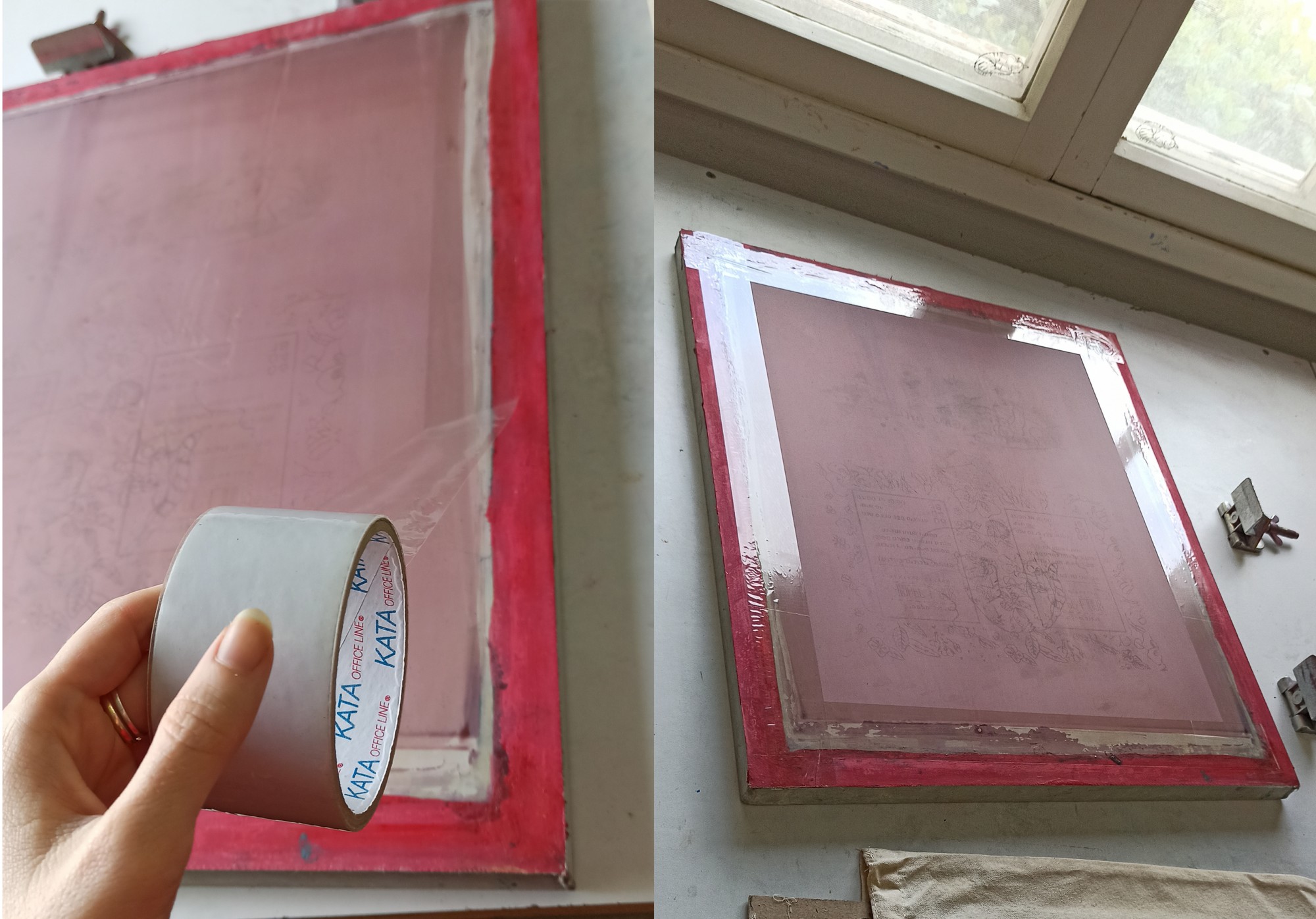 את הרשת שהתייבשה נניח על שולחן העבודה. כעת יש לסגור את המקומות שנשארו הפתוחים ברשת, בהם אין אמולסיה, כדי להימנע מהדפסה דרכם. מדובר בסנטימטר הזה שנמצא ממש ליד המסגרת, זוכרים את שלב 3 של מריחת האמולסיה? אין ברירה למרוח ככה, אם נרצה למרוח מהמסגרת ממש המריחה תצא לא אחידה ולא דקה מספיק. את הסנטימטר הלבן ללא האמולסיה סוגרים כל פעם לפני ההדפסה על ידי הדבקה של סלוטייפ שקוף רחב על הצד השטוח של הרשת.