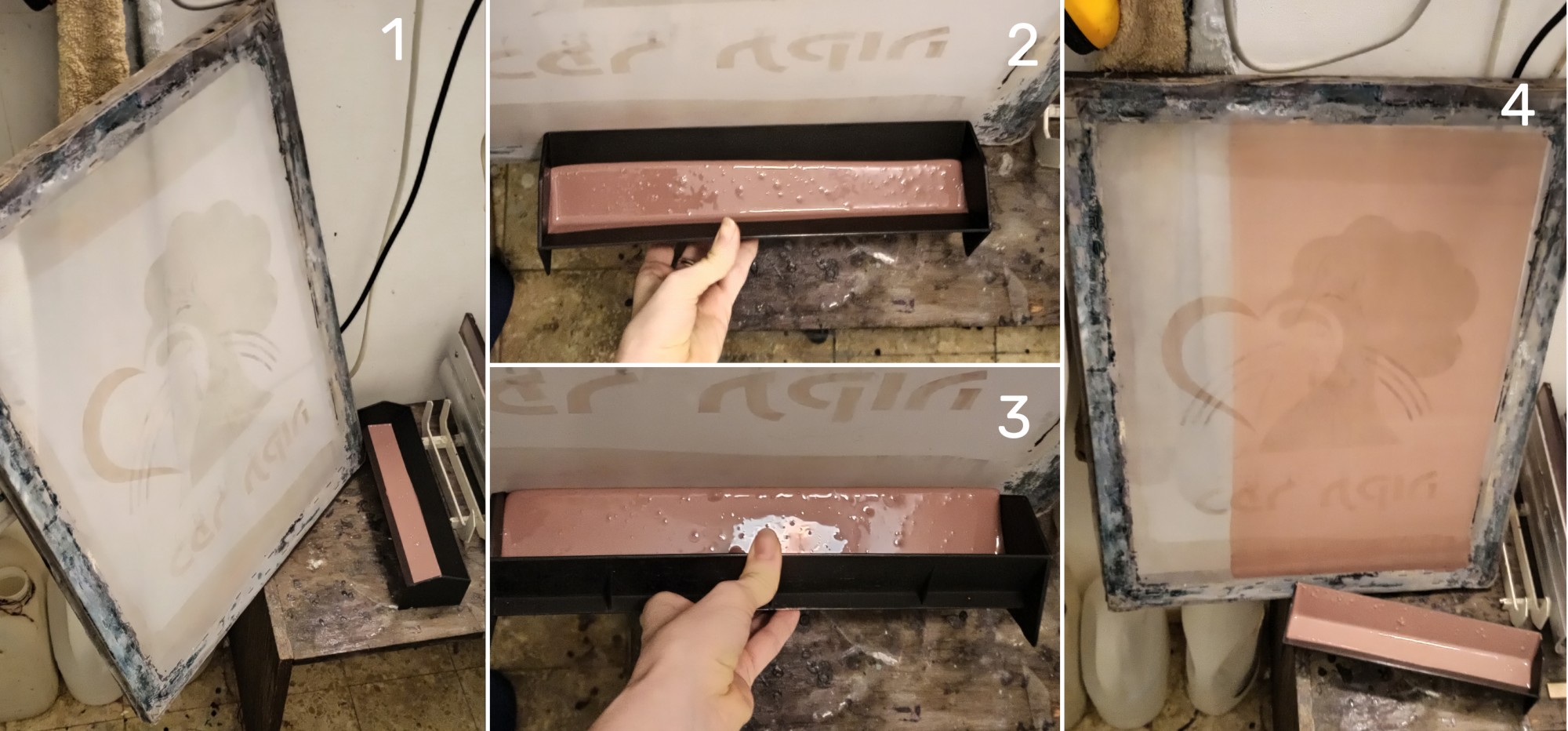 בשלב הזה נשתמש בכף למריחת אמולסיה, זו כף ייעודית שקונים מספקים של הדפס רשת. לכף יש בסיס אליו היא עומדת ושני צידי מריחה: אחד עבה ואחד דק. מומלץ למרוח את האמולסיה על הצד הדק כדי לקבל שכבה דקה של אמולסיה על הרשת - שזו המטרה בשלב זה.