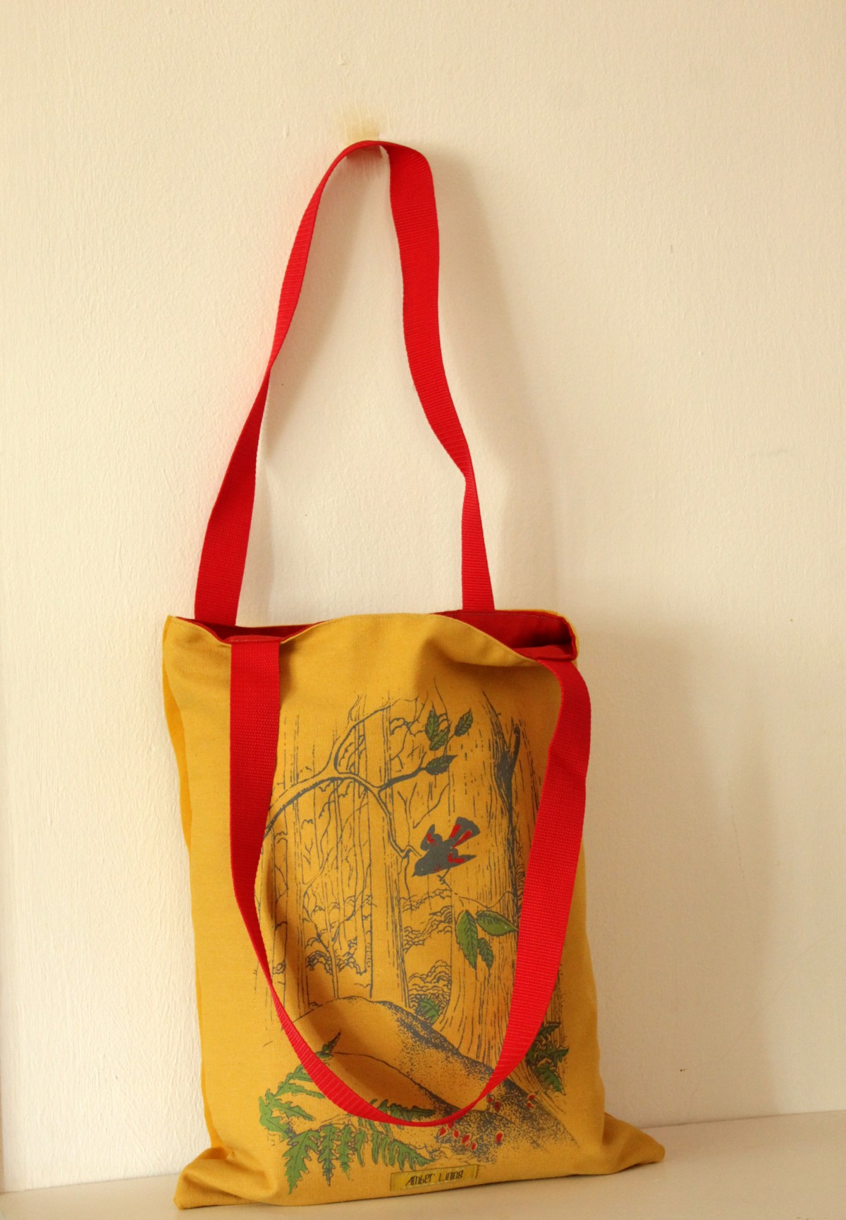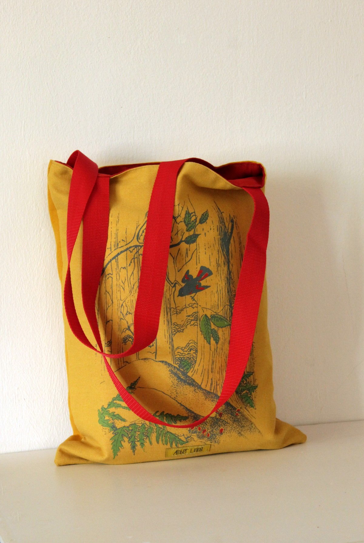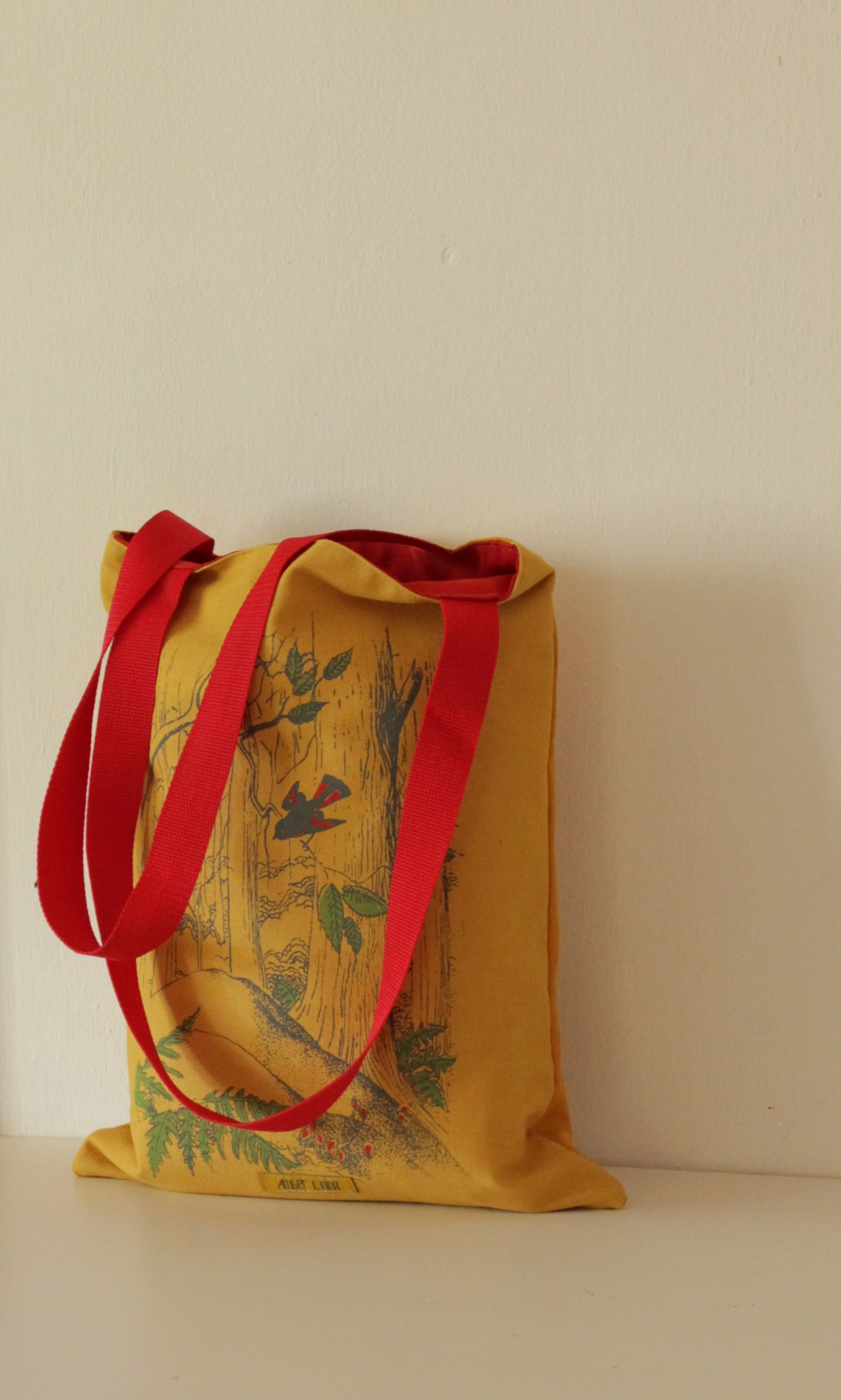 It was screen printed with forest illustration in red and green.