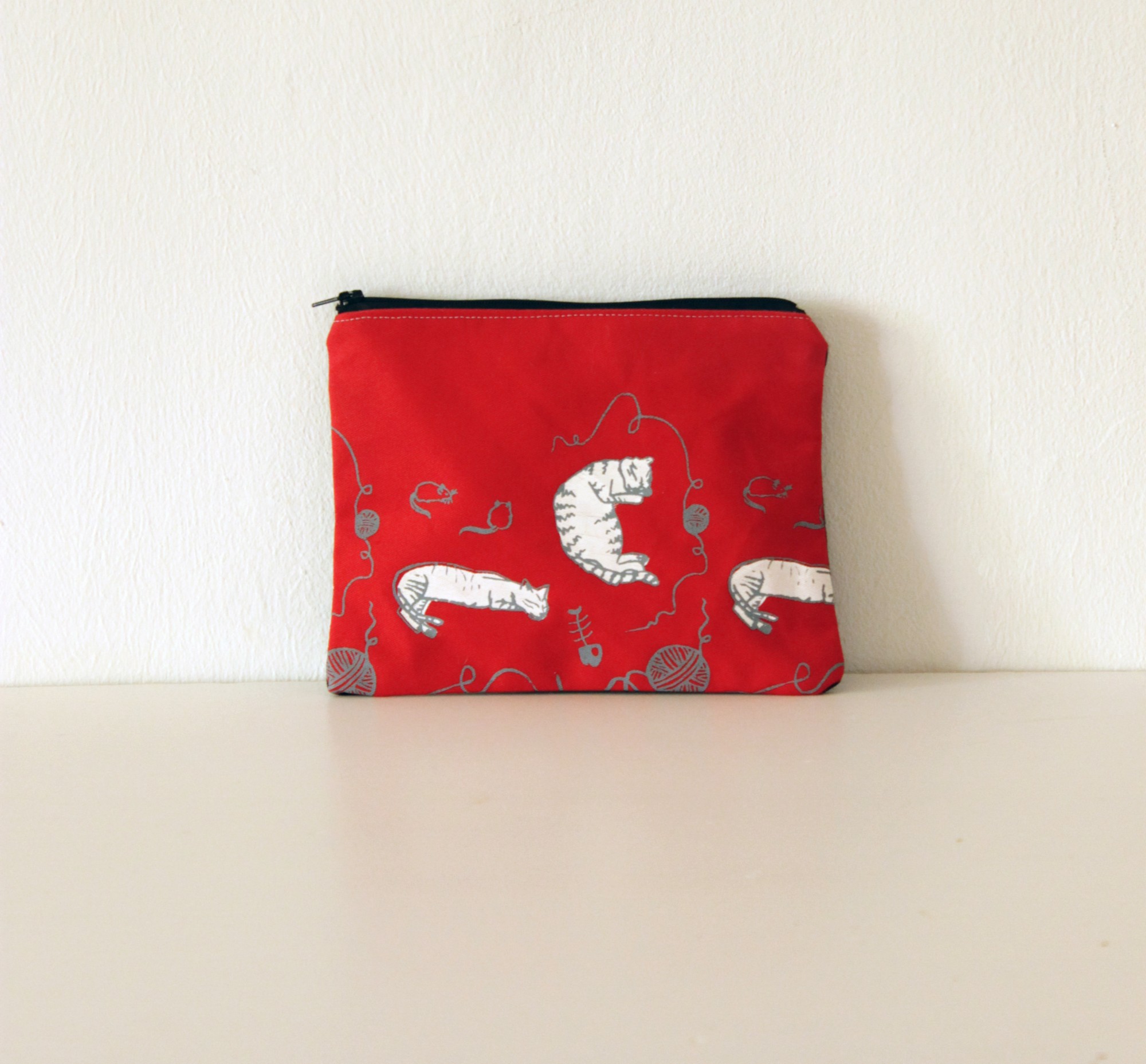 Made of red canvas with screen printed cats original illustration in grey and white.