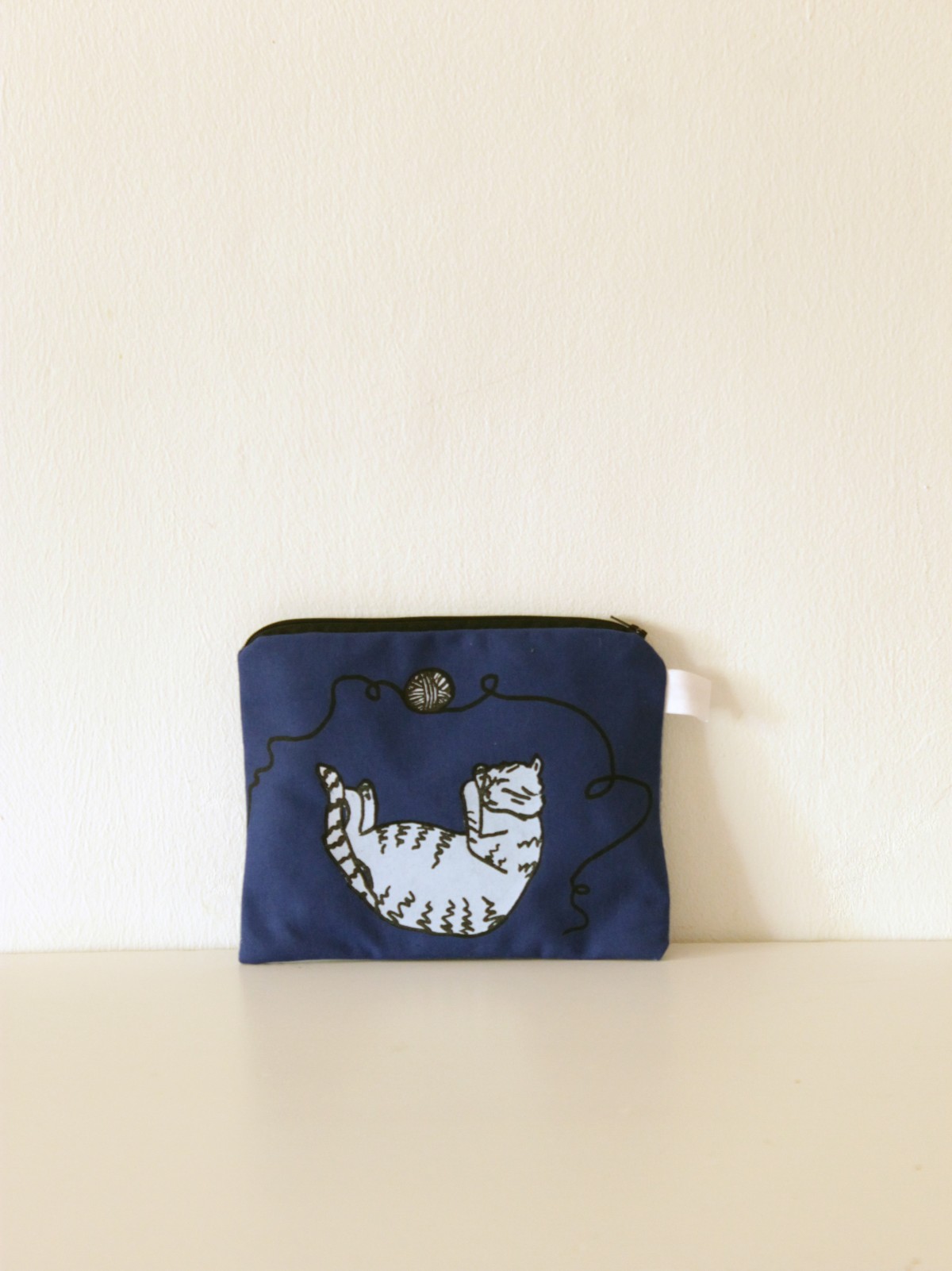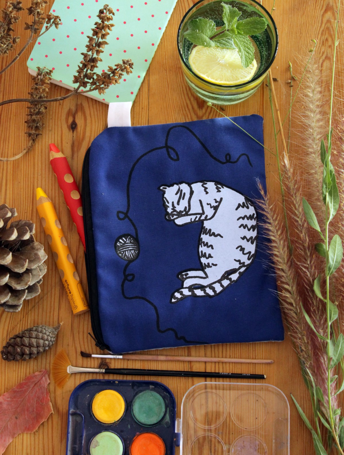 Made of blue canvas with screen printed catoriginal illustration in black and white.
