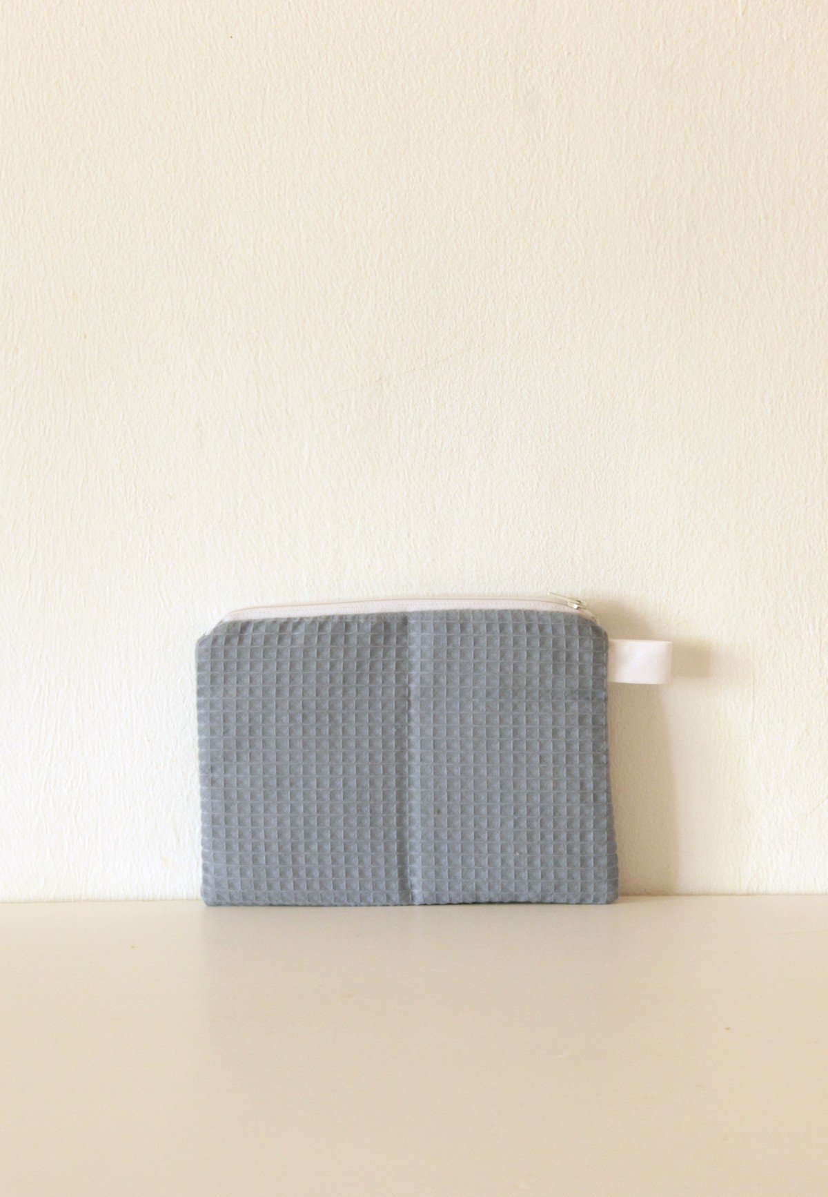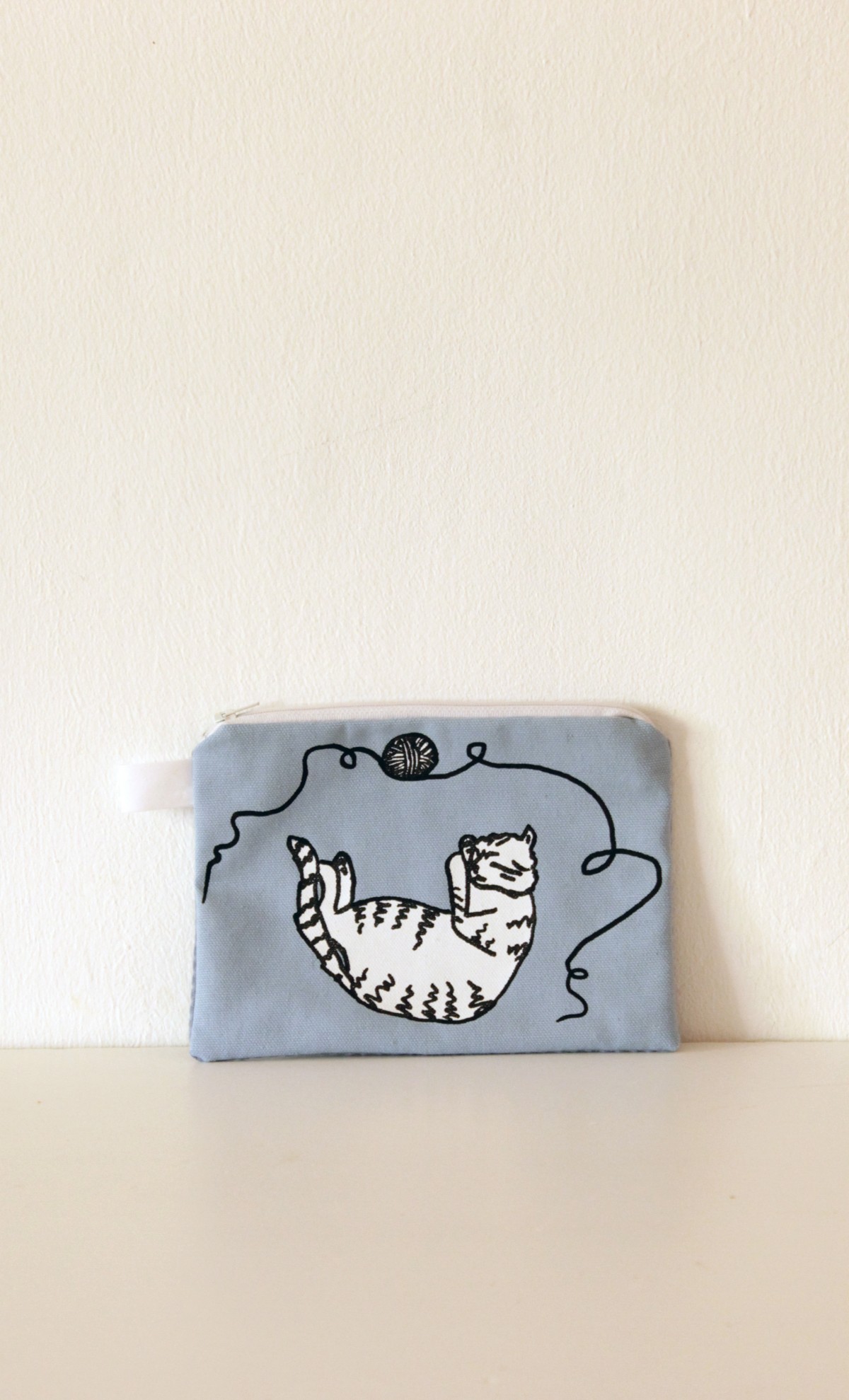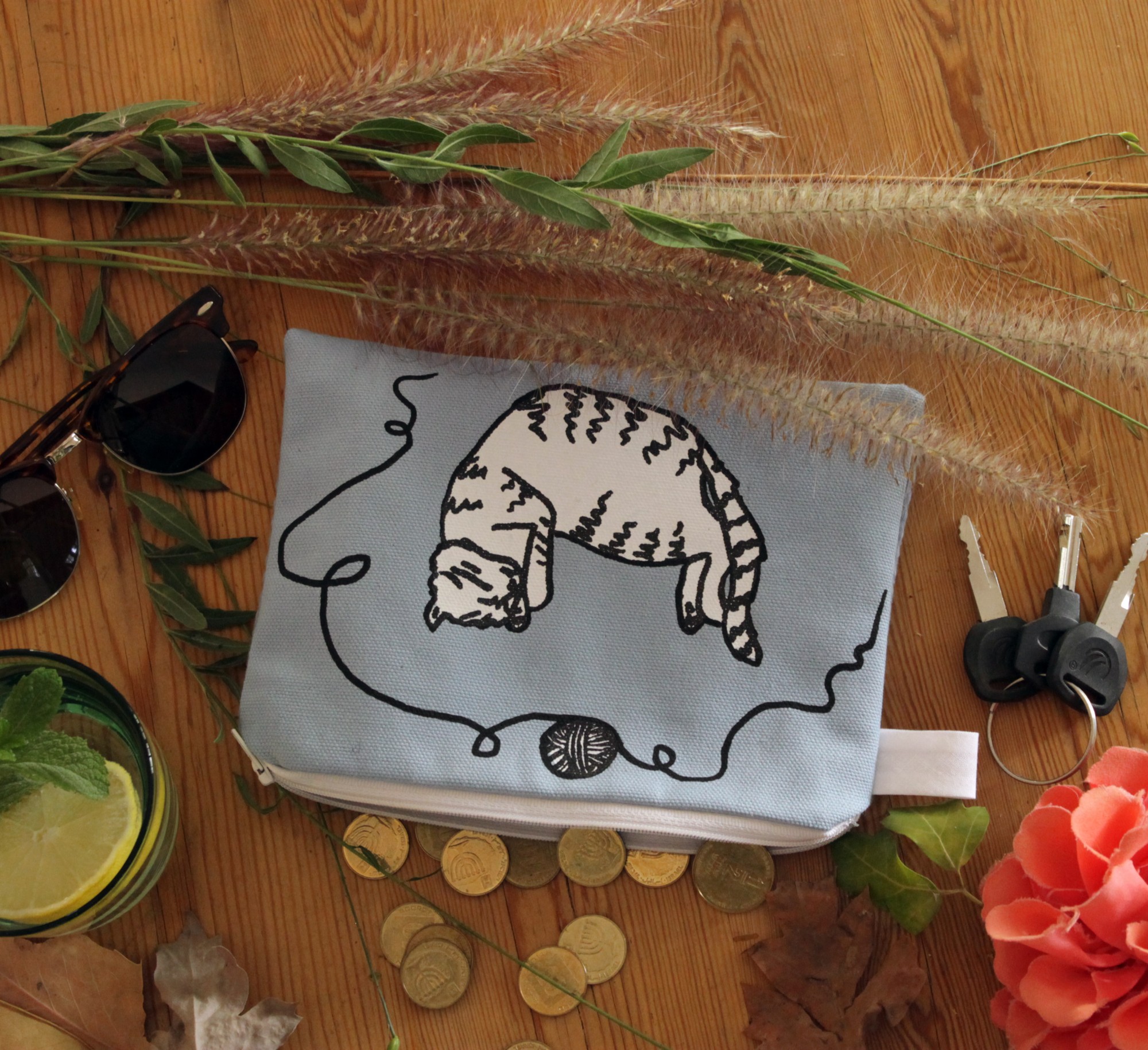 Made of light blue canvas with screen printed cat original illustration in black and white.