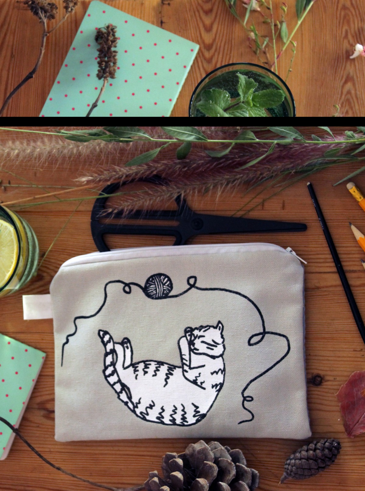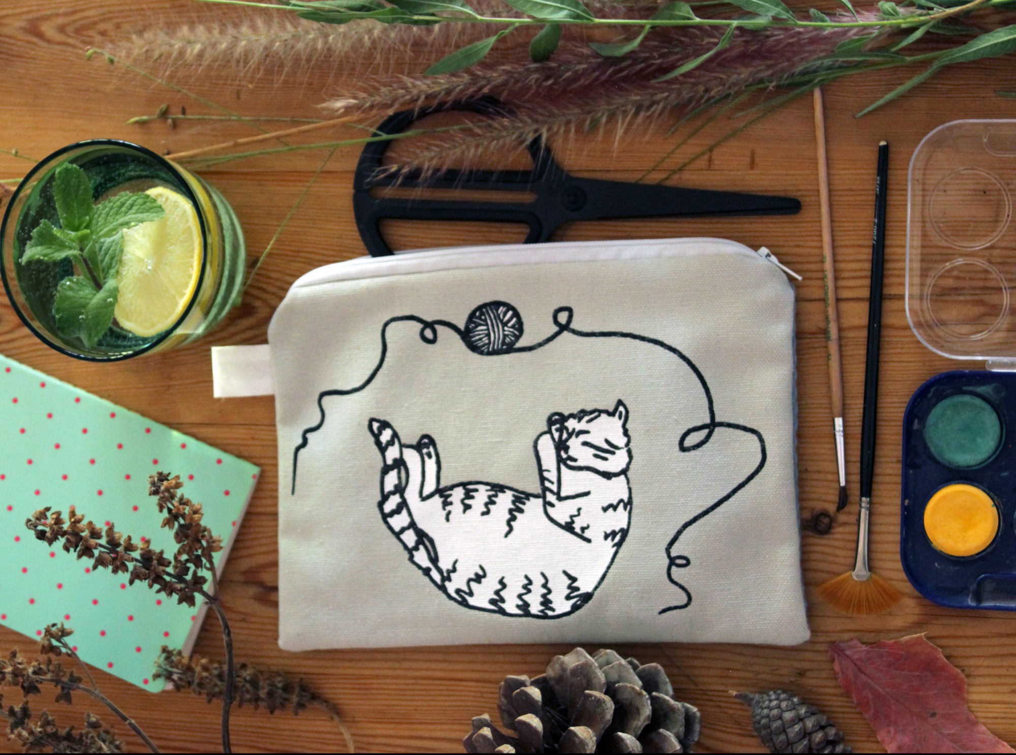 Made of light blue canvas with screen printed cat original illustration in black and white.