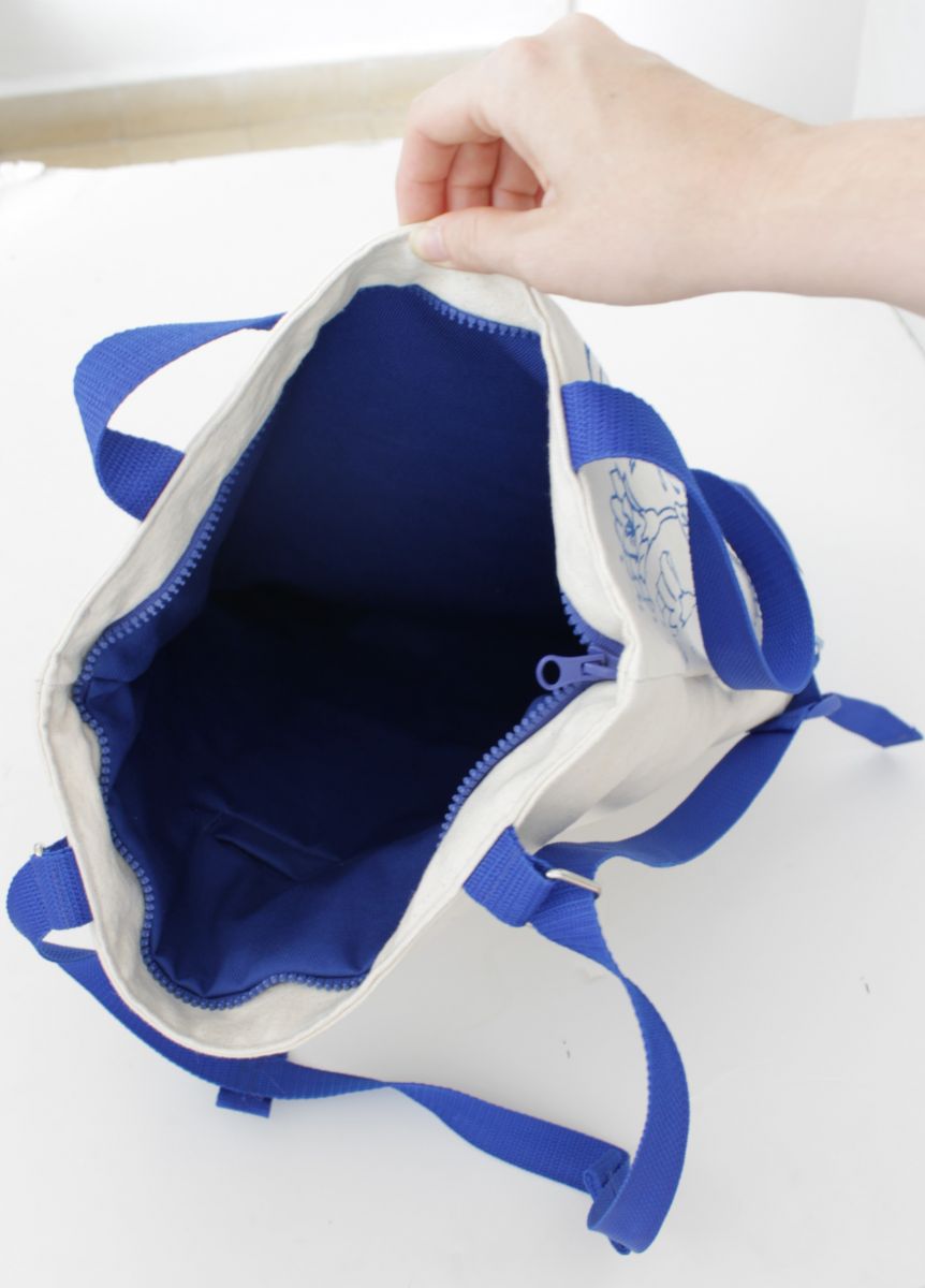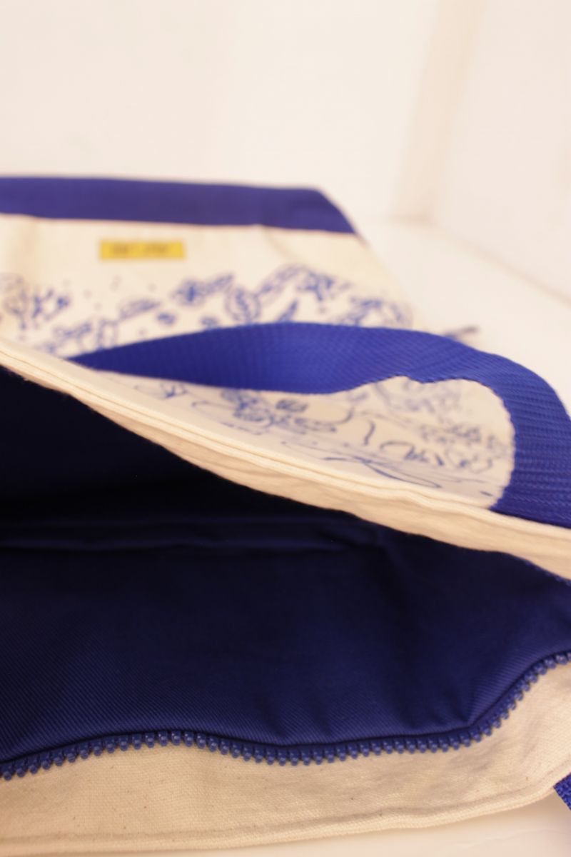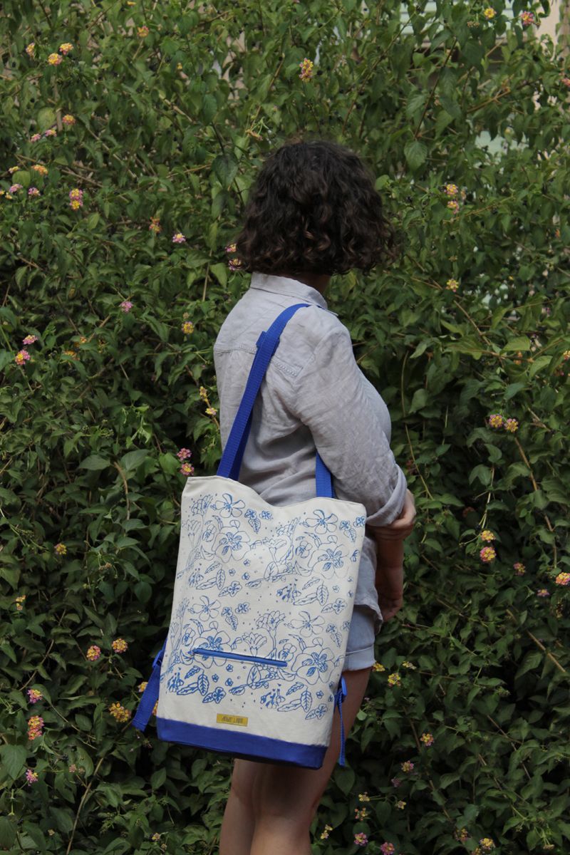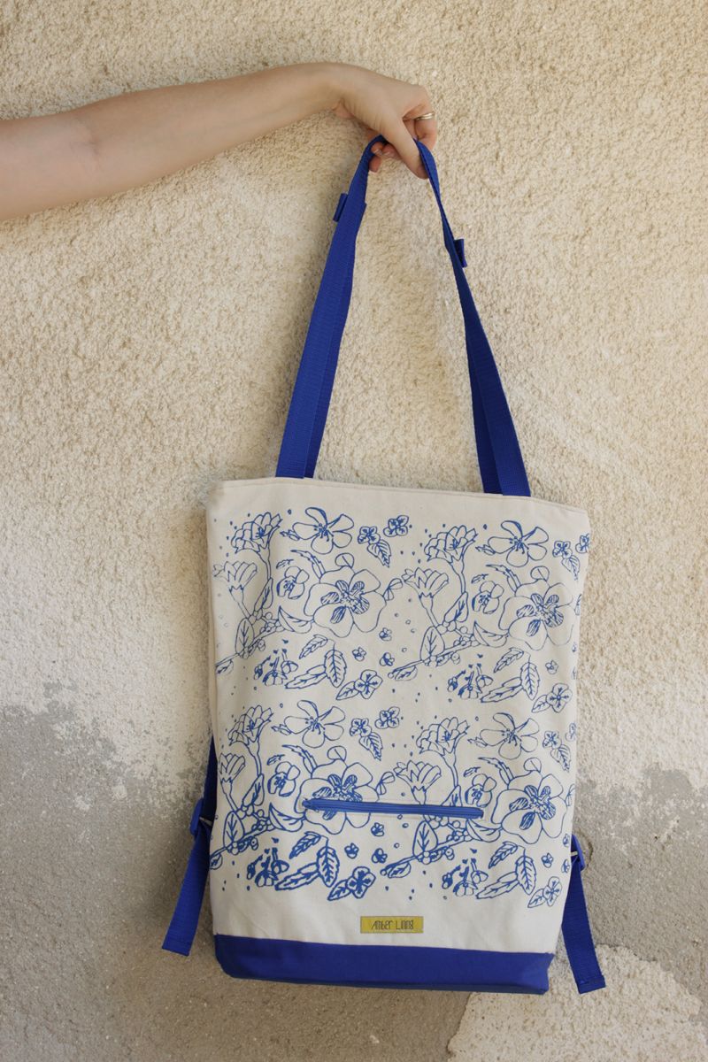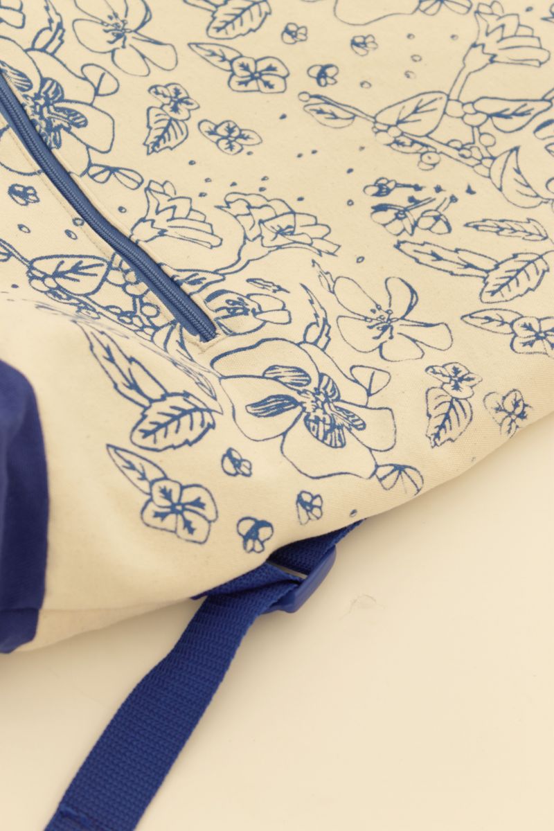 The body of the bag is 100% high quality durable cotton, it has adjustable polypropylene straps and closes with zipper at the top. It was screen printed with flowers illustration in blue.