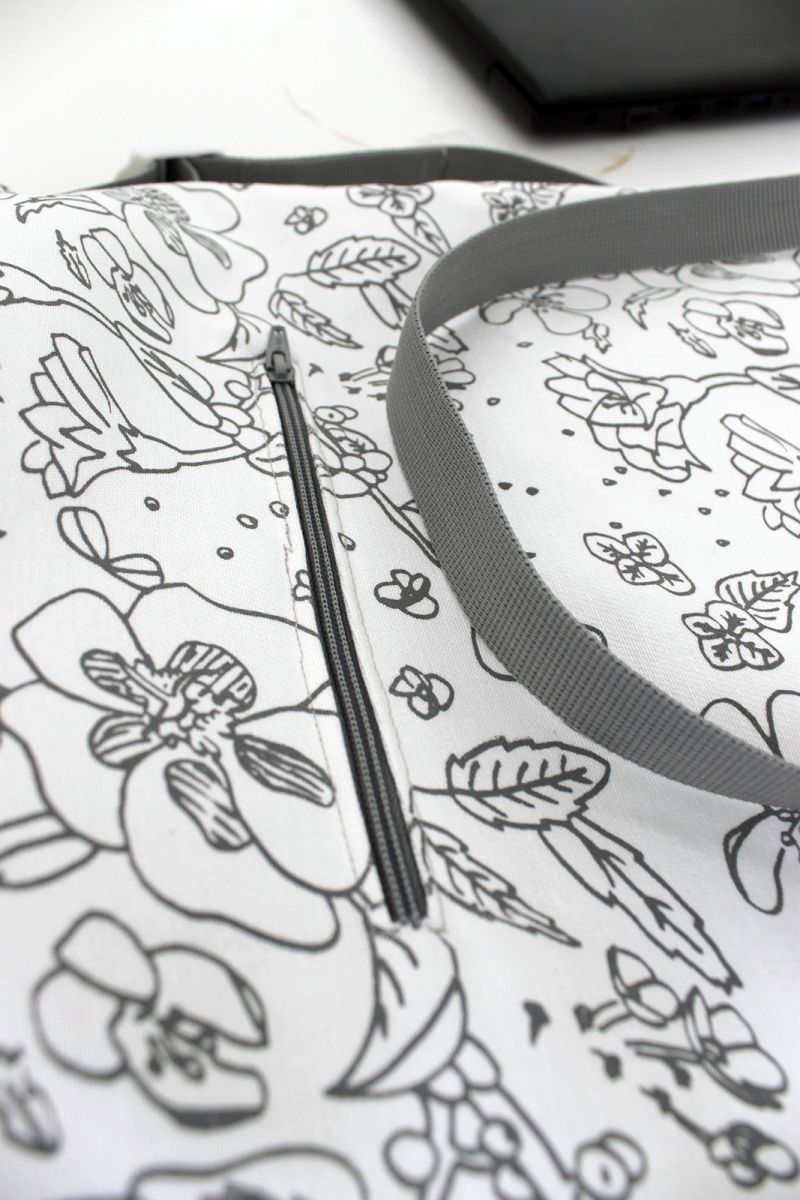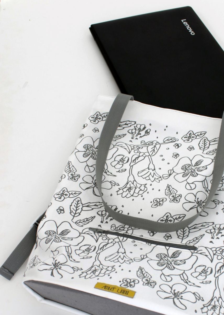 The body of the bag is 100% high quality durable white cotton, it has adjustable polypropylene straps and closes with zipper at the top. It was screen printed with flowers illustration in grey.