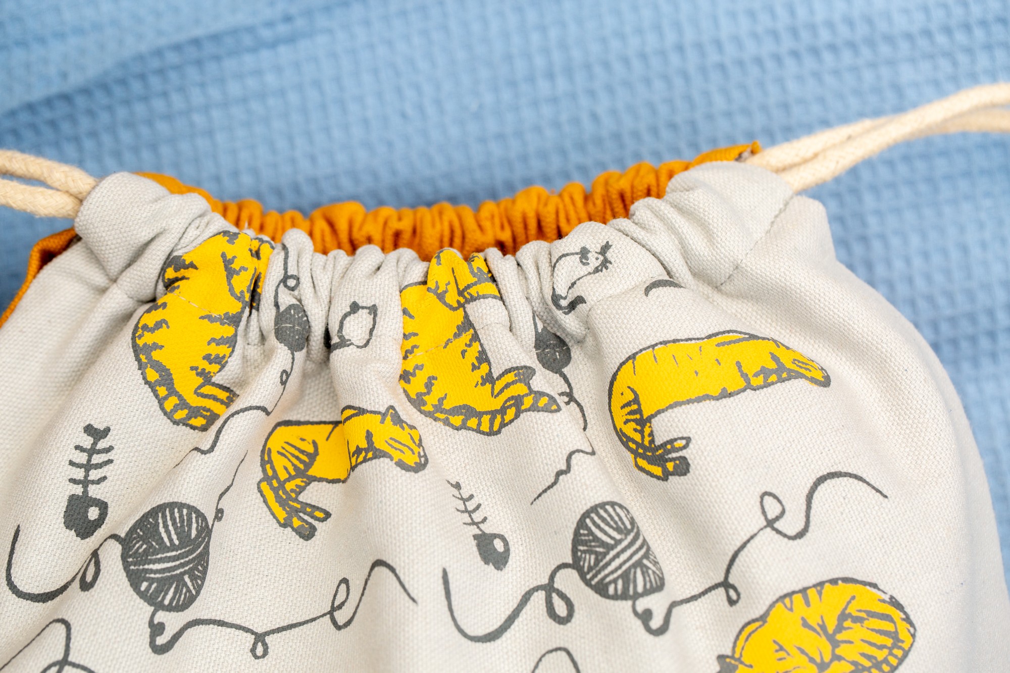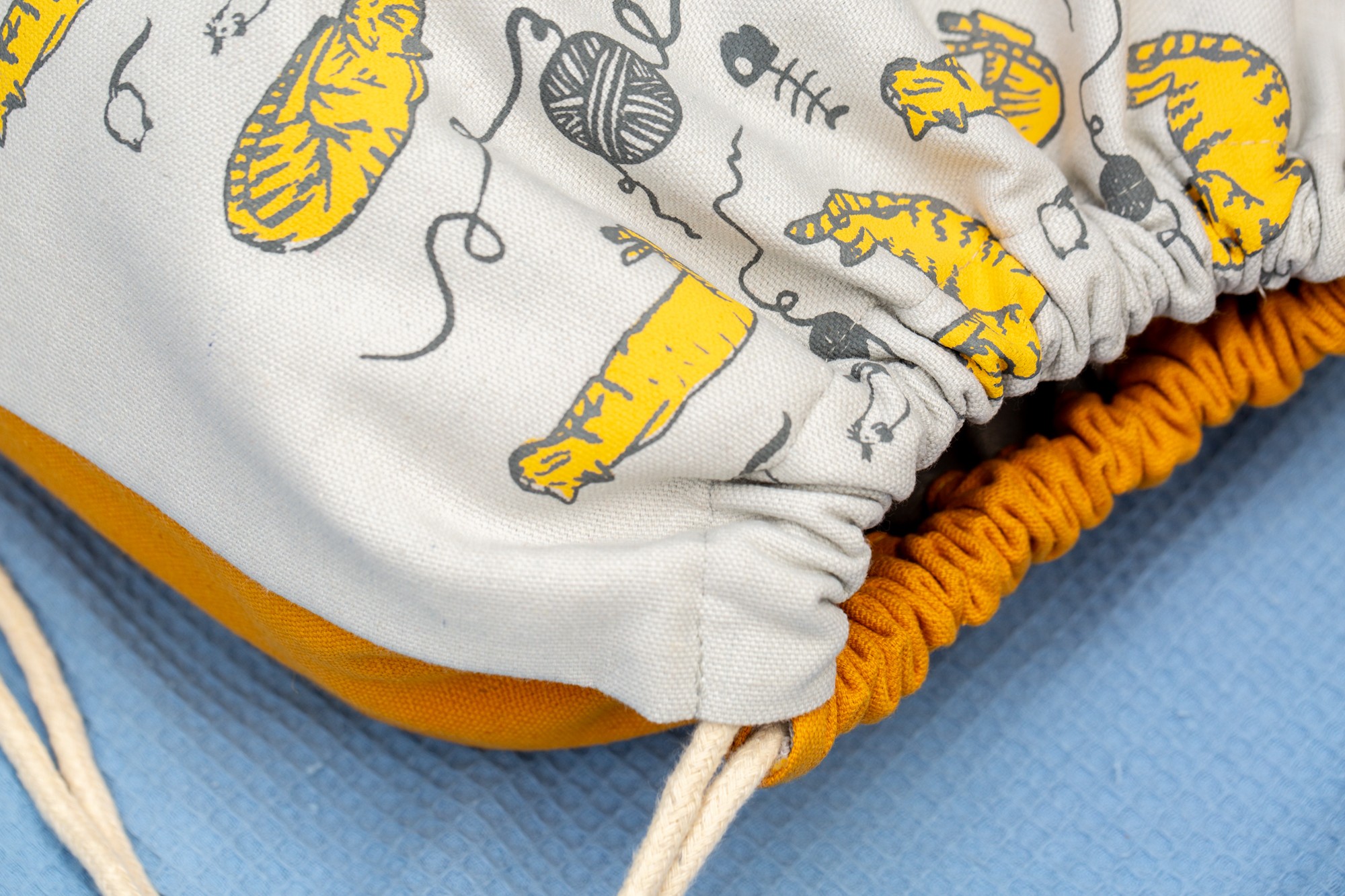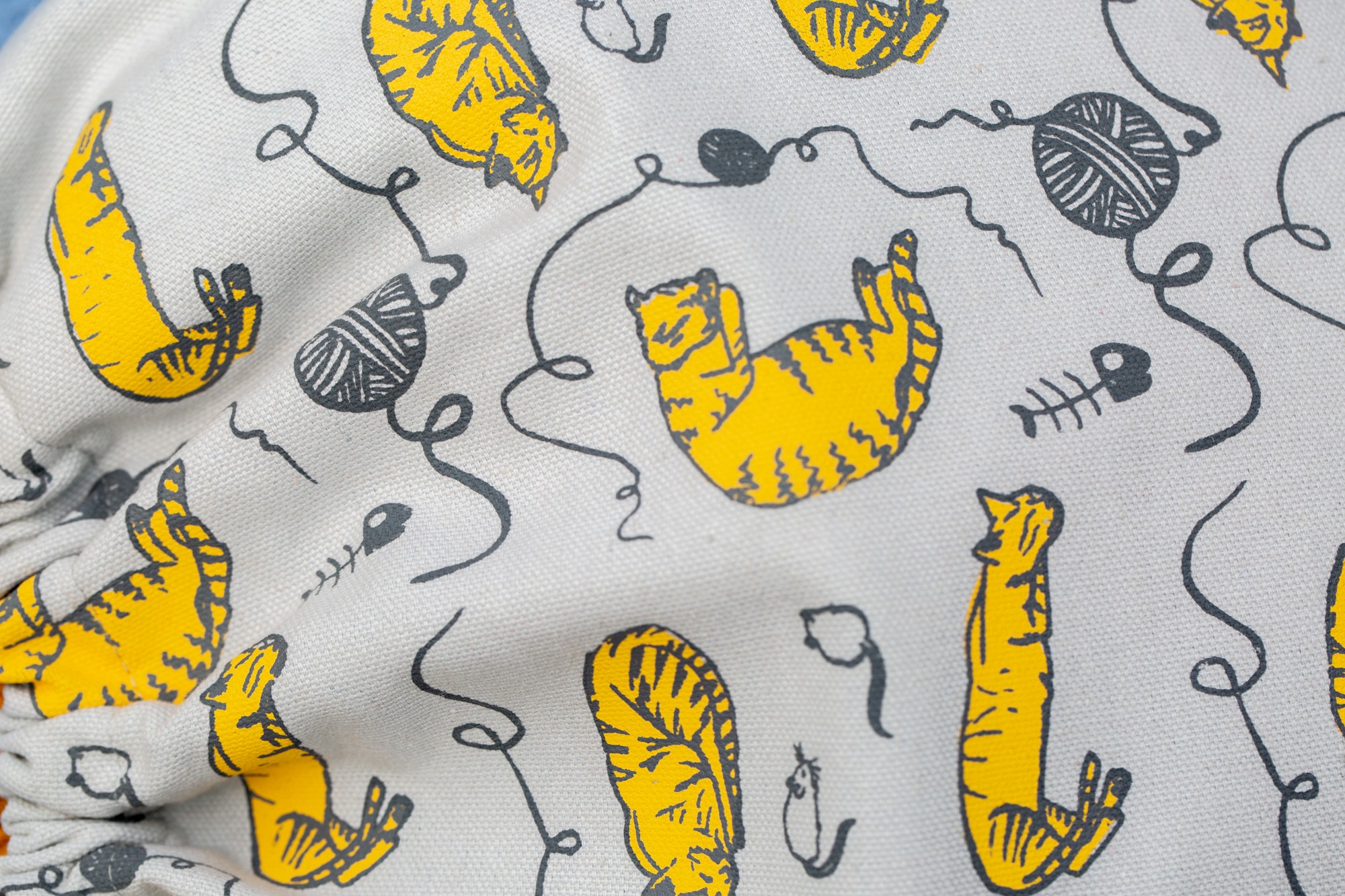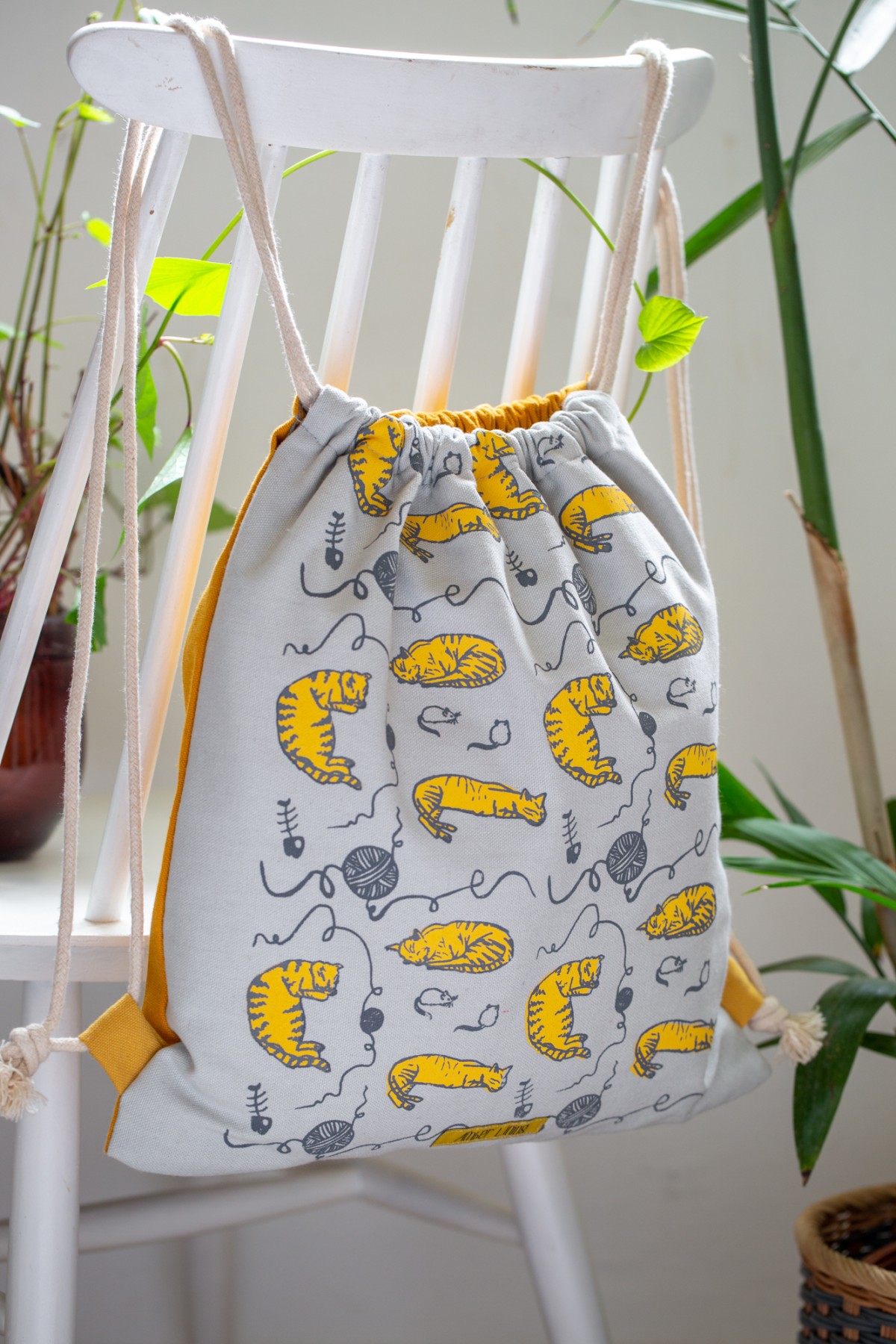 The body of the bag is 100% a high quality white cotton and it was screen printed with mustard color cats.