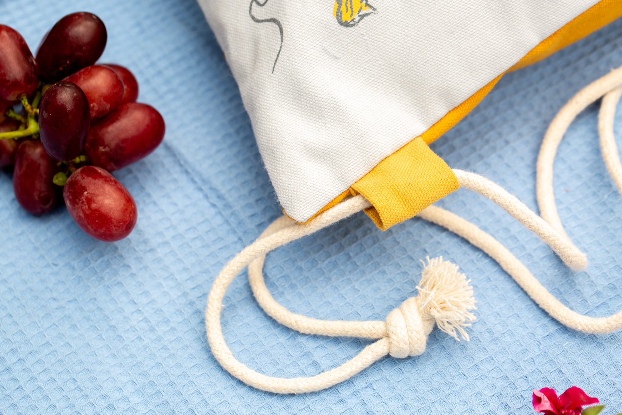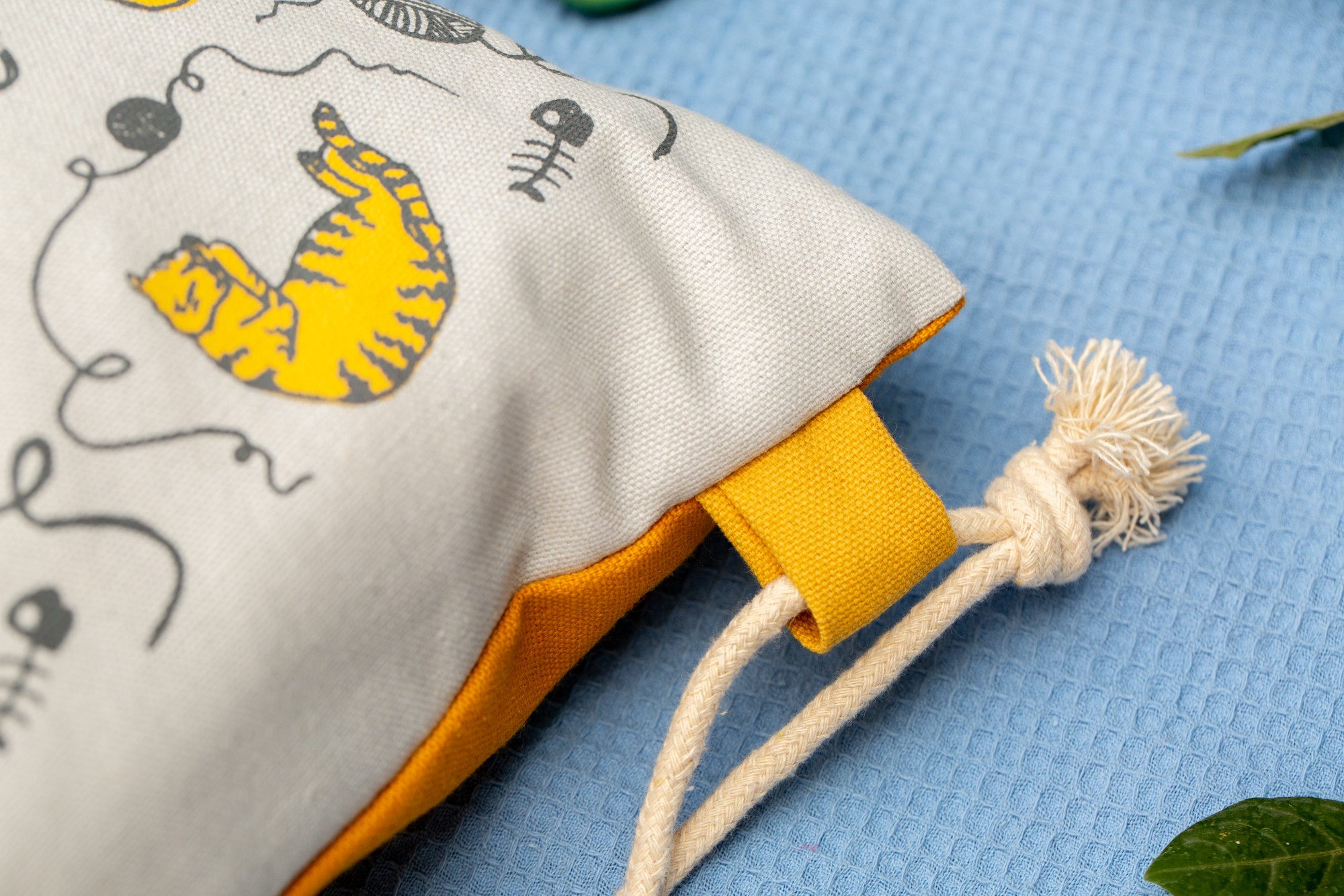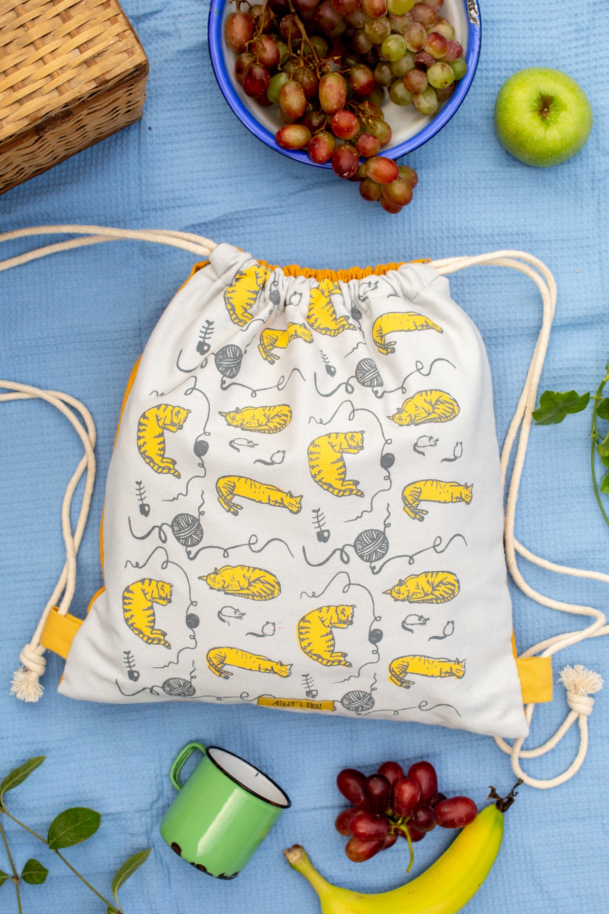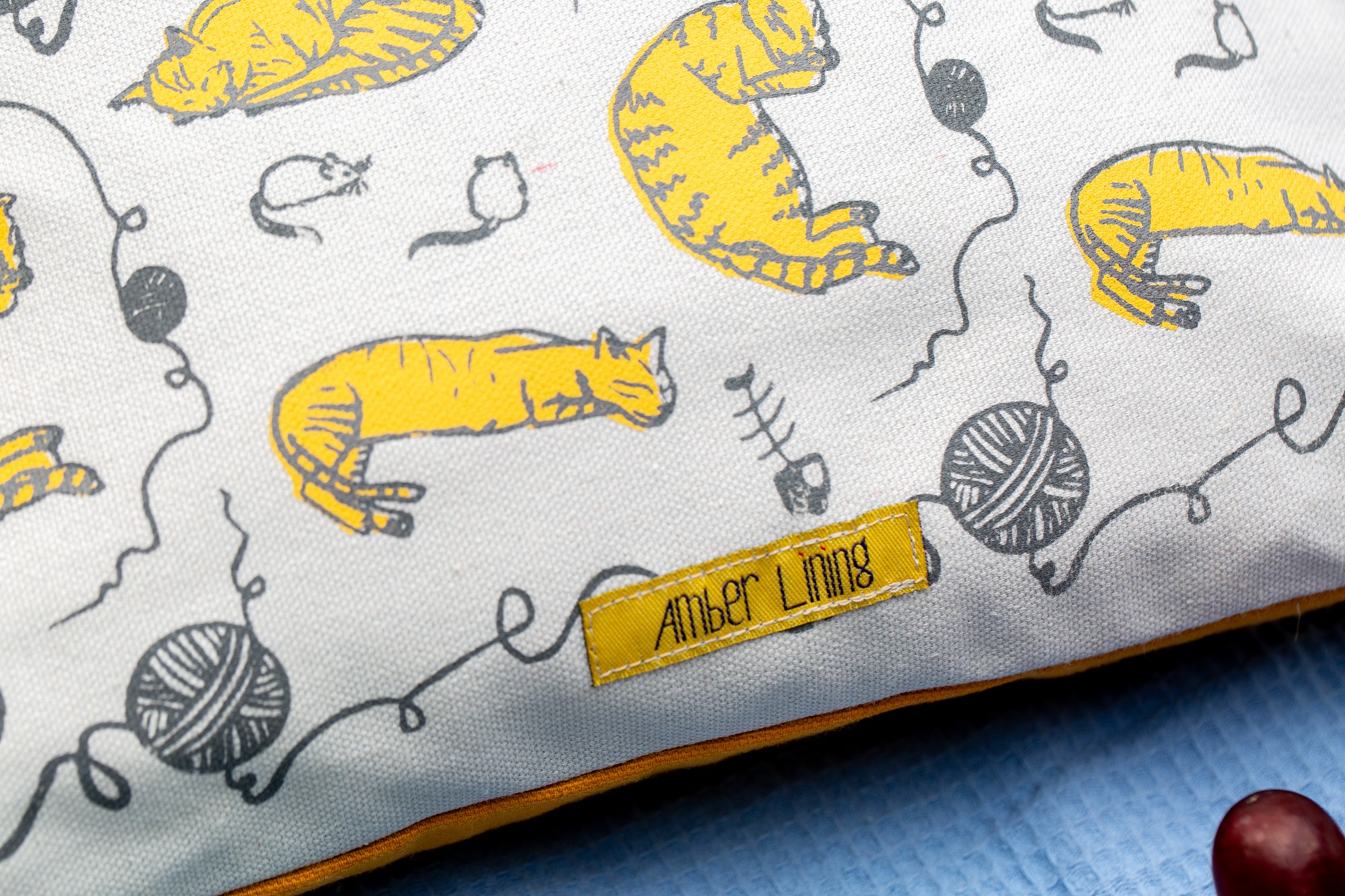The body of the bag is 100% a high quality white cotton and it was screen printed with mustard color cats.