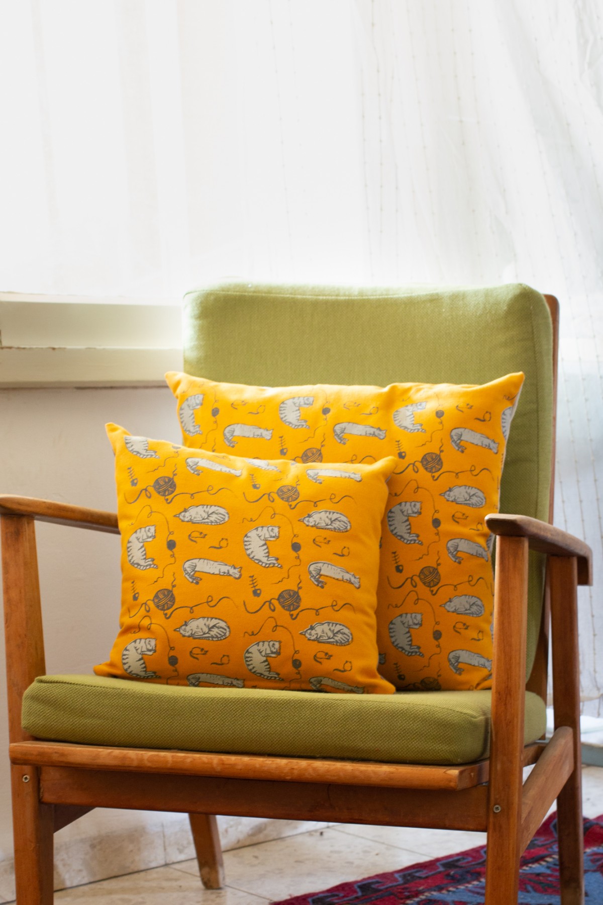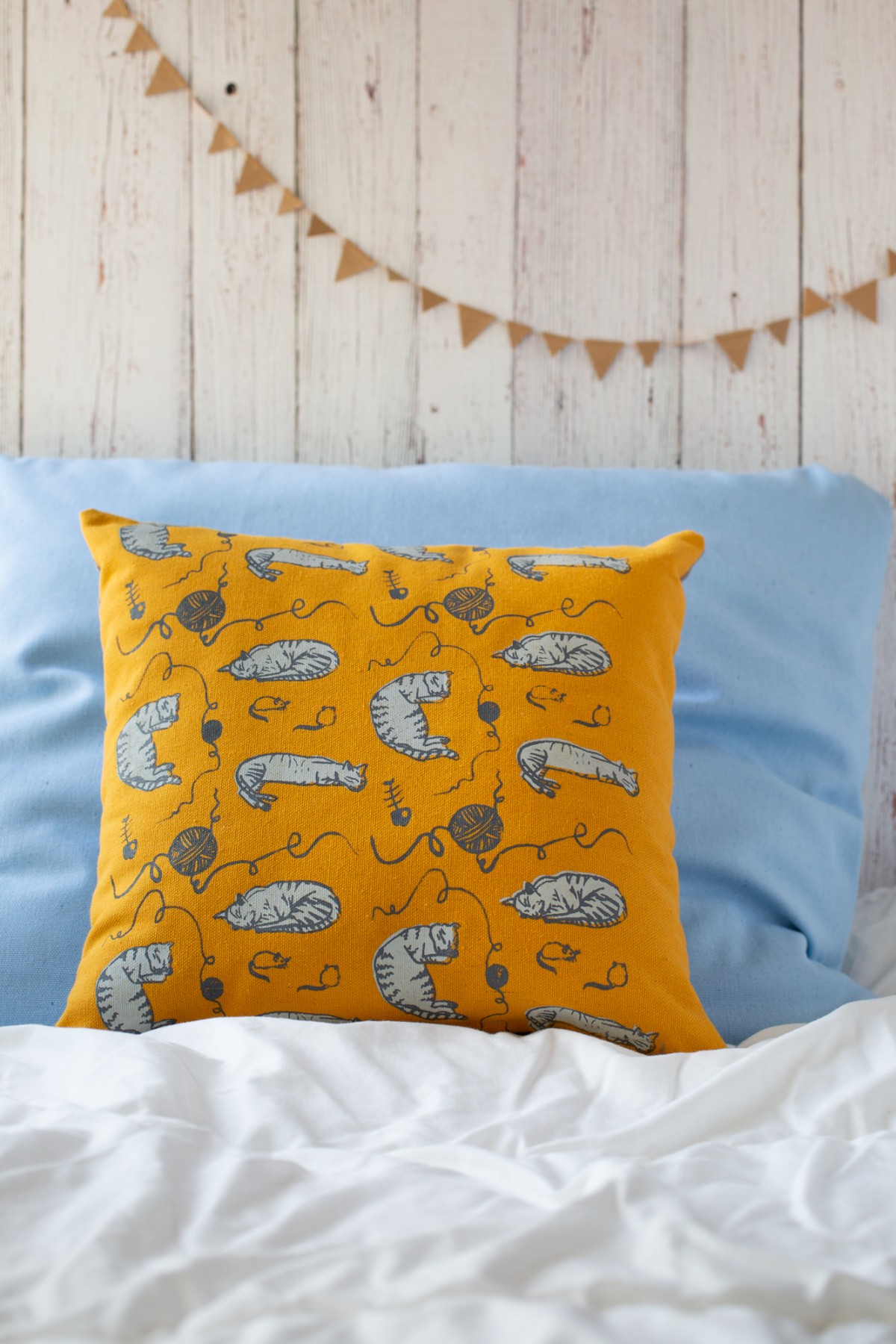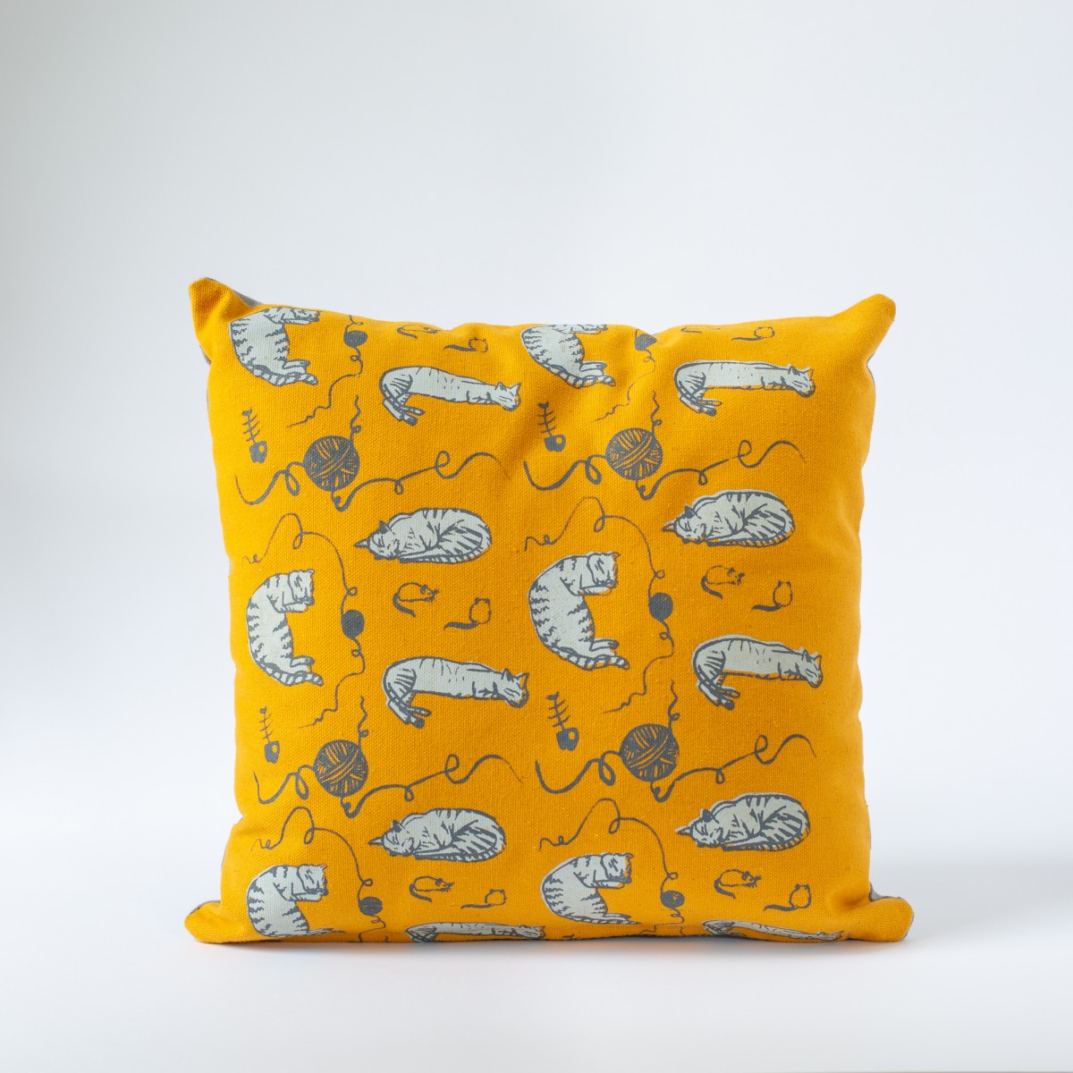 The pillow cover is 13.7"x 13.7" (35 cm x 35 cm) made of yellow mustard cotton fabric that was screen printed with original cat illustration.