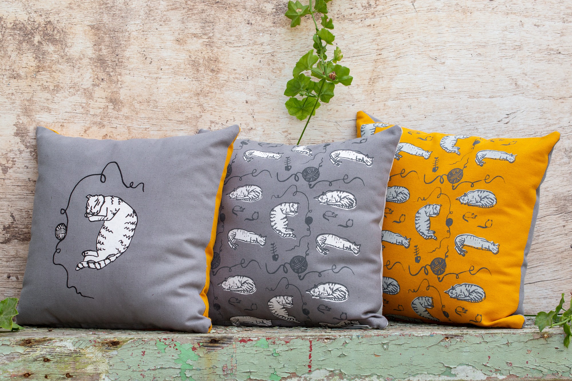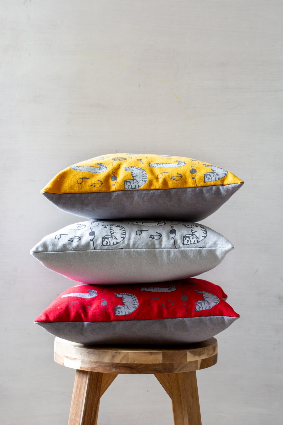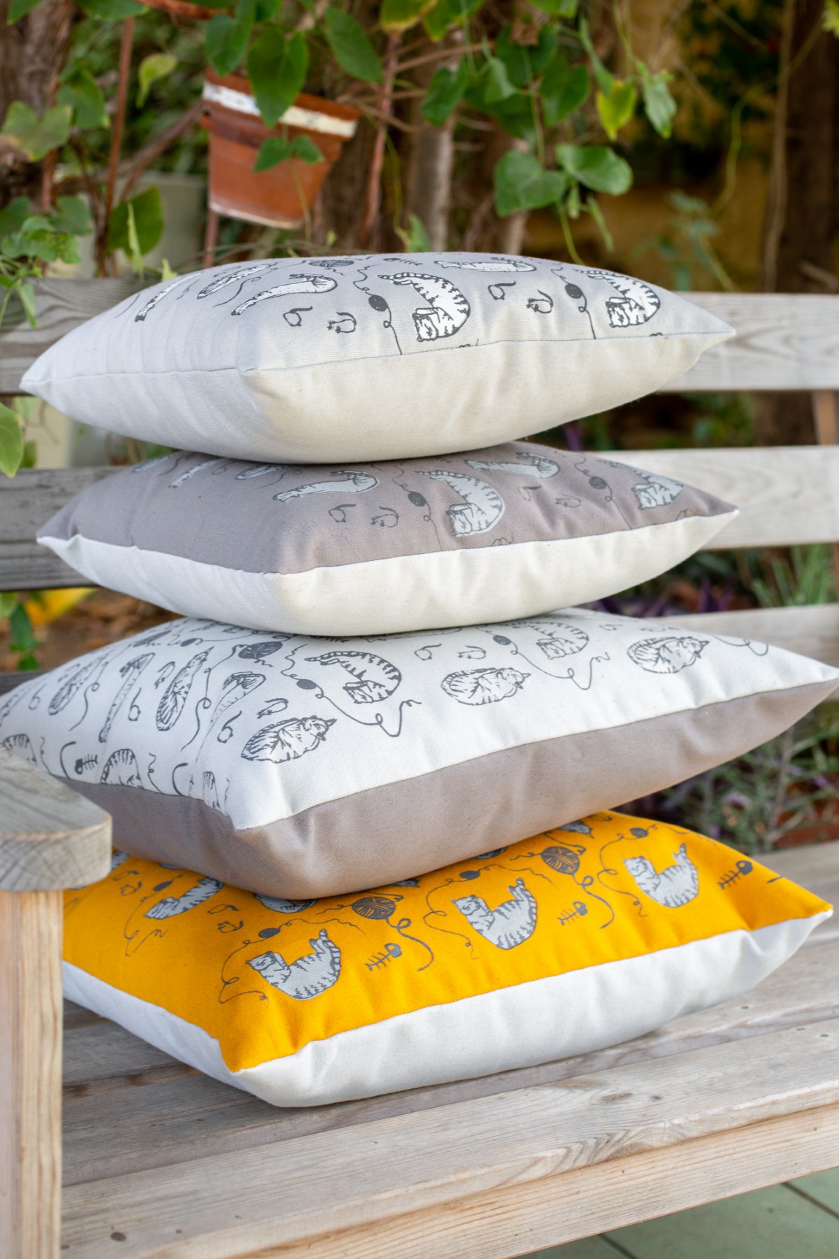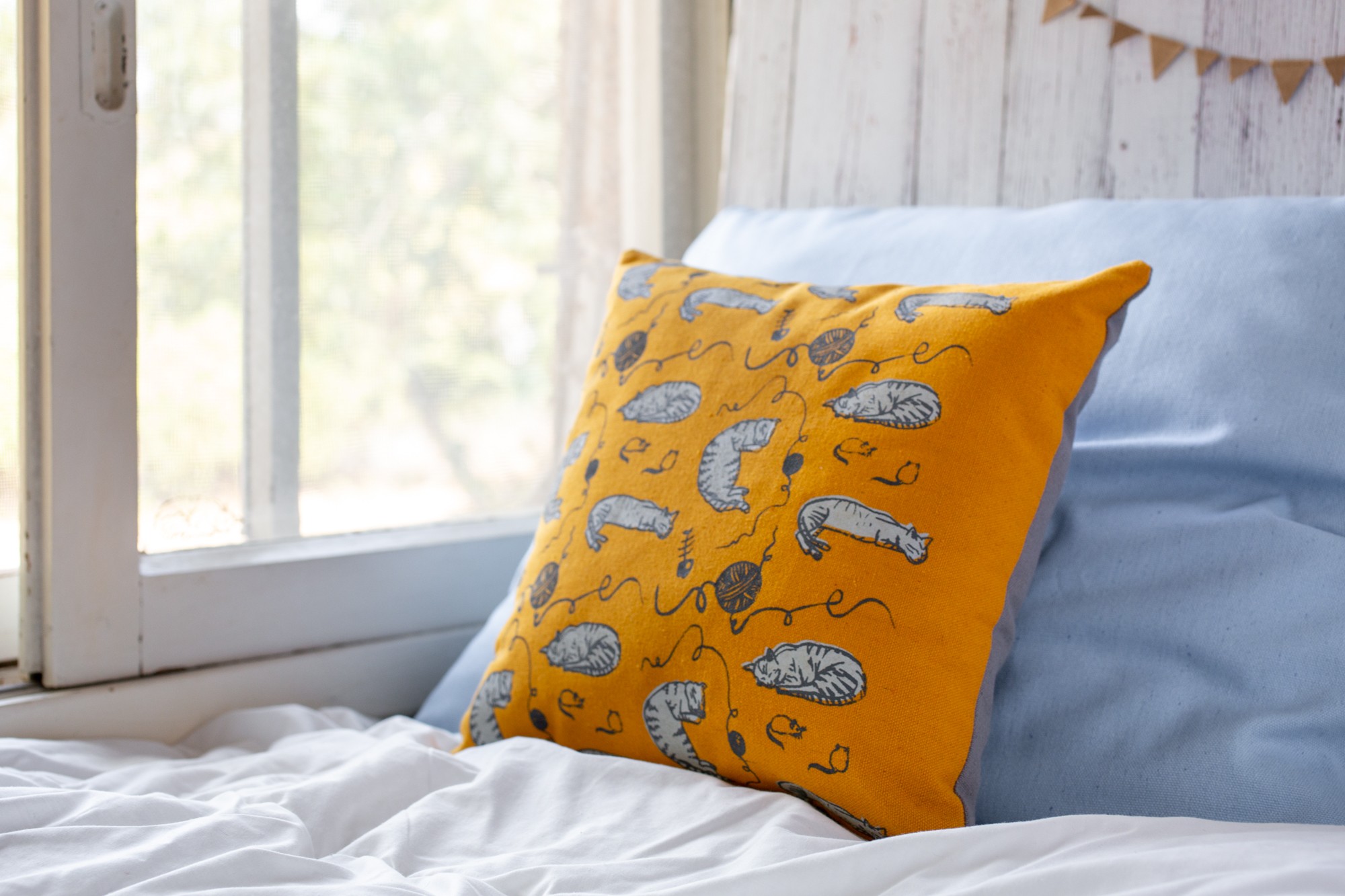 The pillow cover is 13.7"x 13.7" (35 cm x 35 cm) made of yellow mustard cotton fabric that was screen printed with original cat illustration.