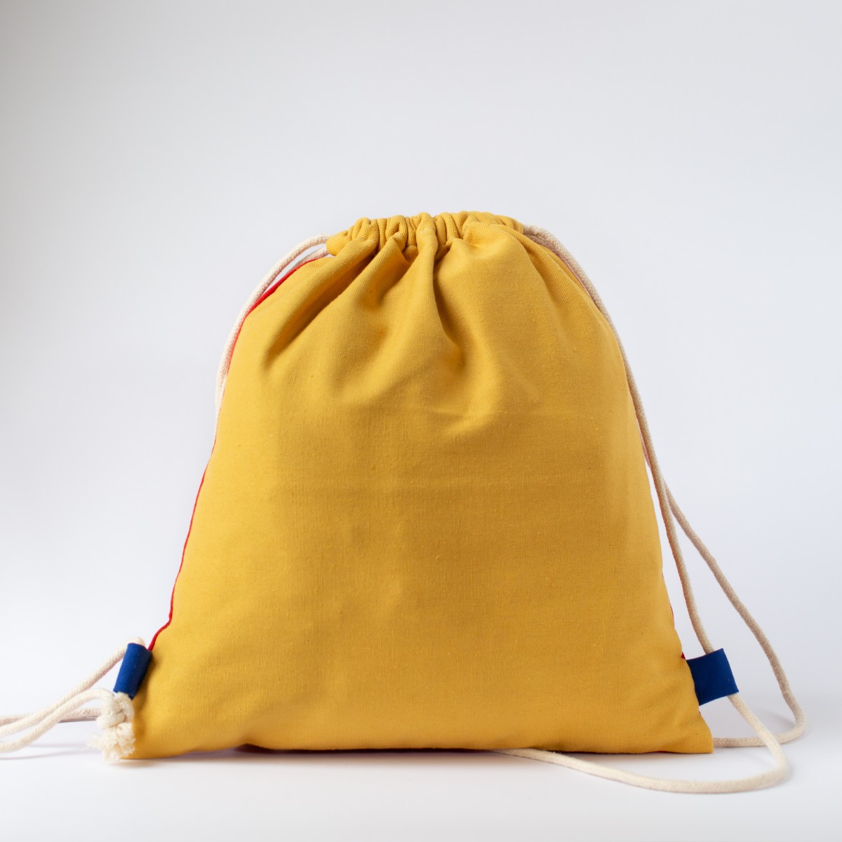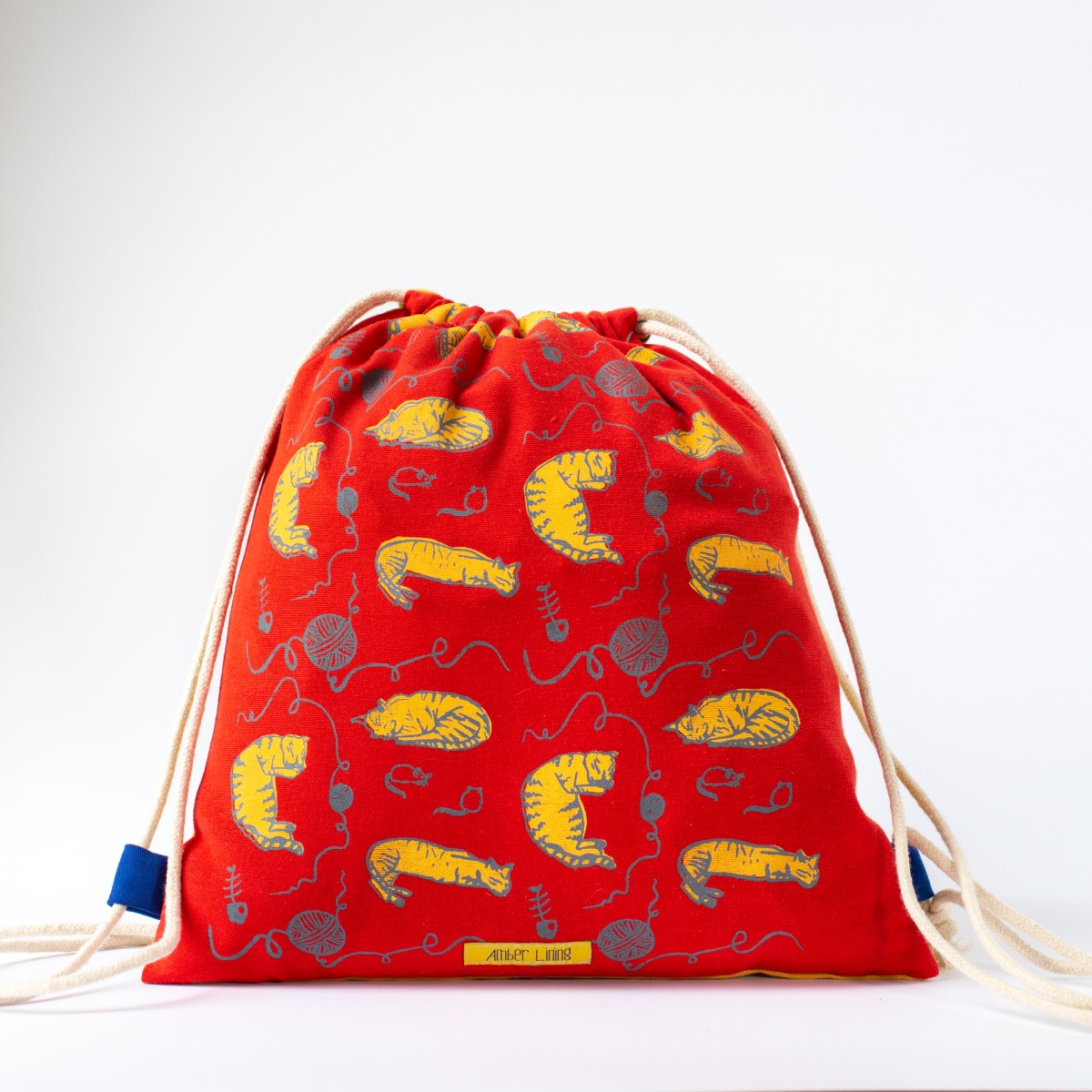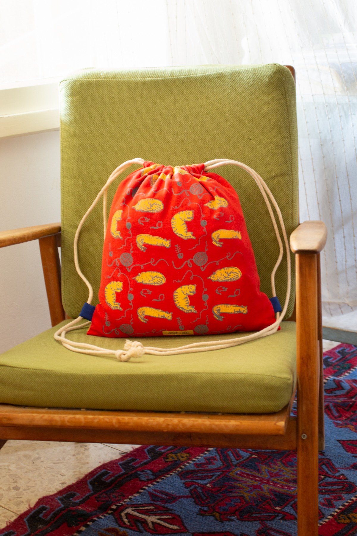 The body of the bag is 100% a high quality red cotton and it was screen printed with cat illustration in mustard color.