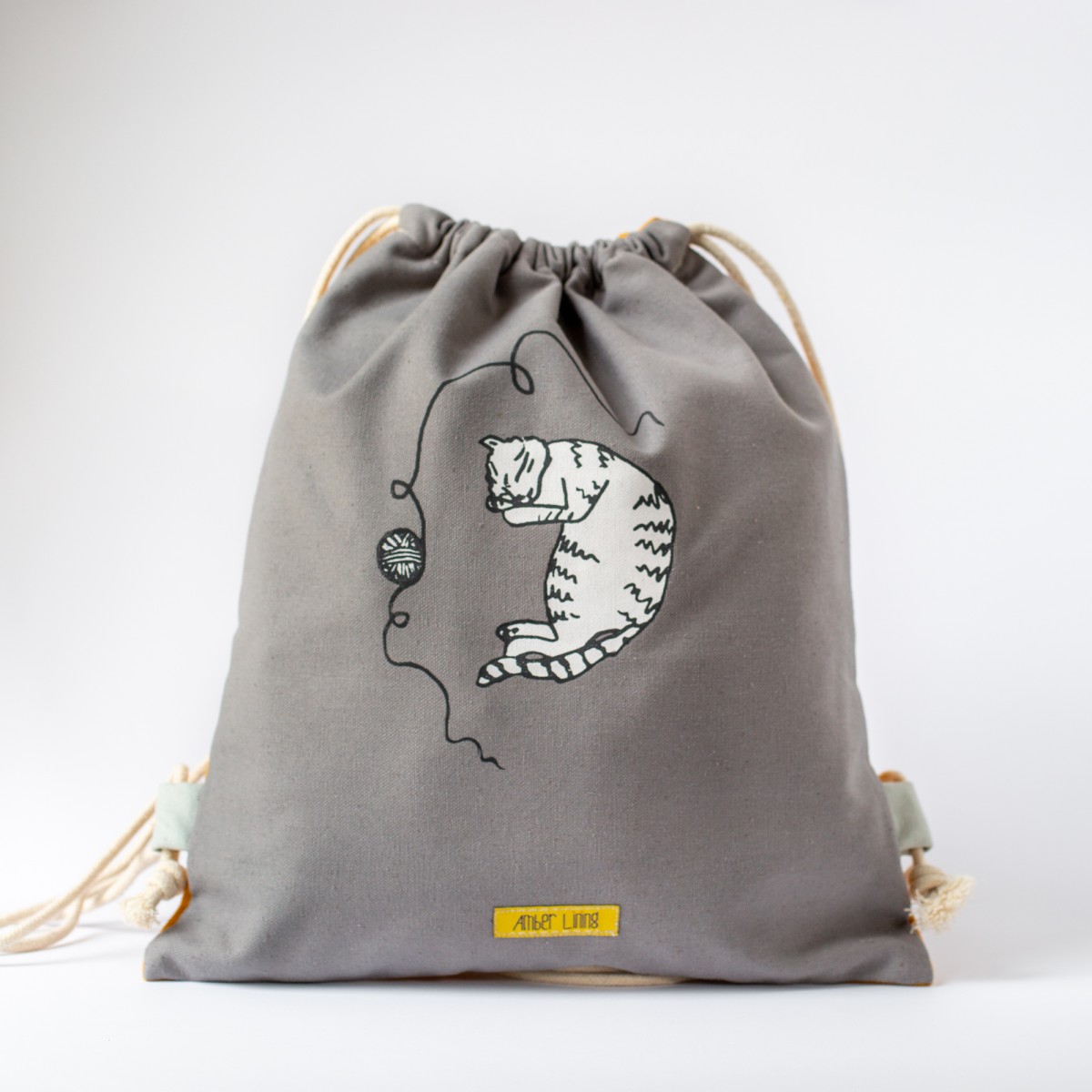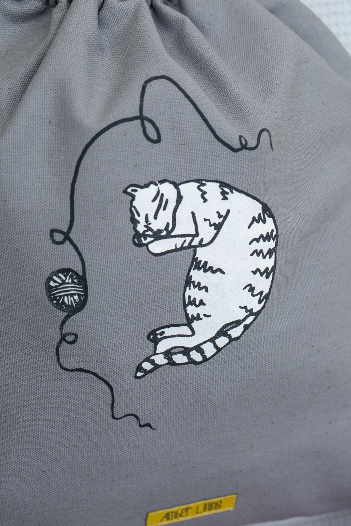 The body of the bag is 100% a high quality gray cotton and it was screen printed with cat illustration in white.