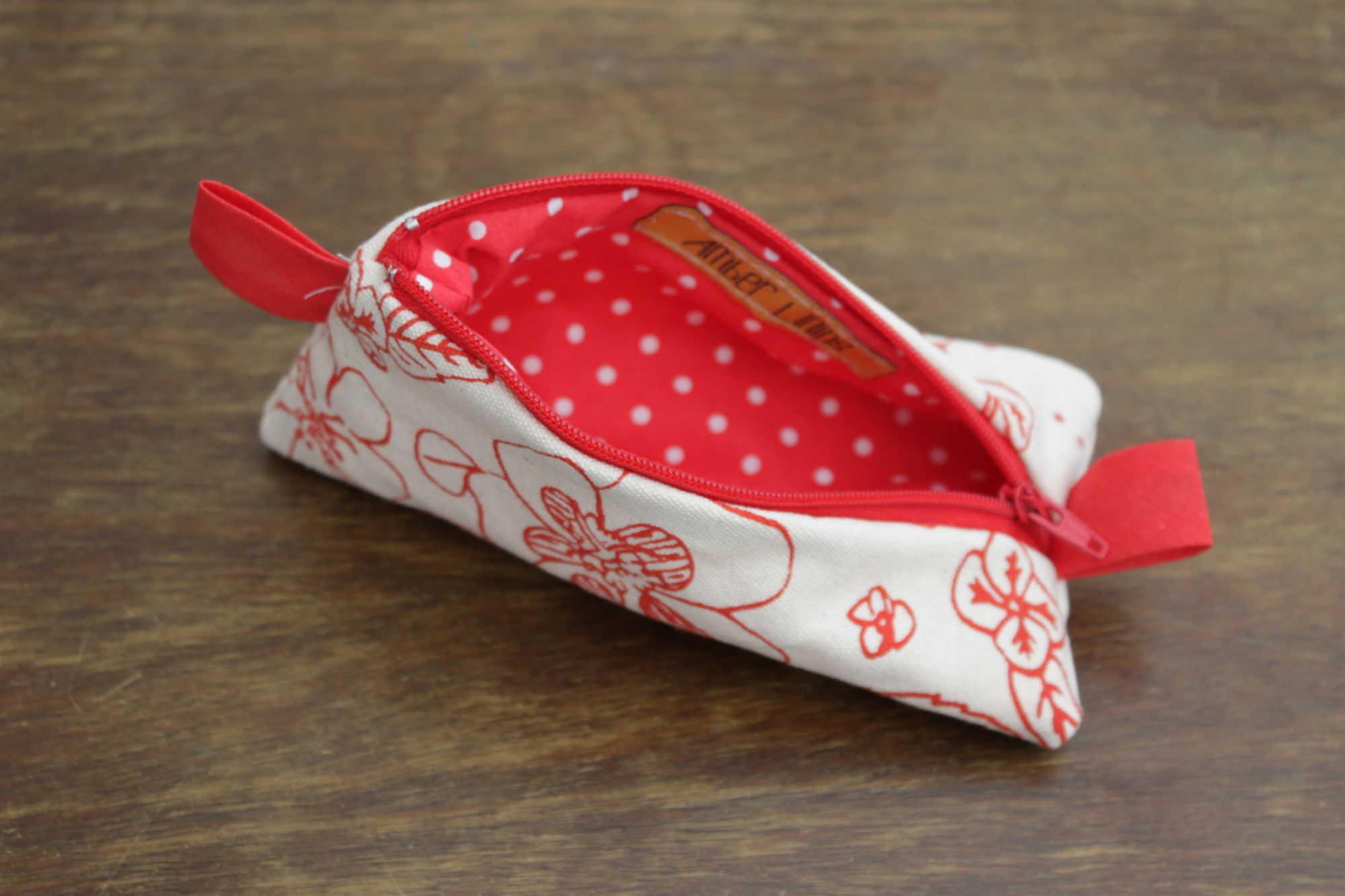 Lining is red fabric with small white polka dots.