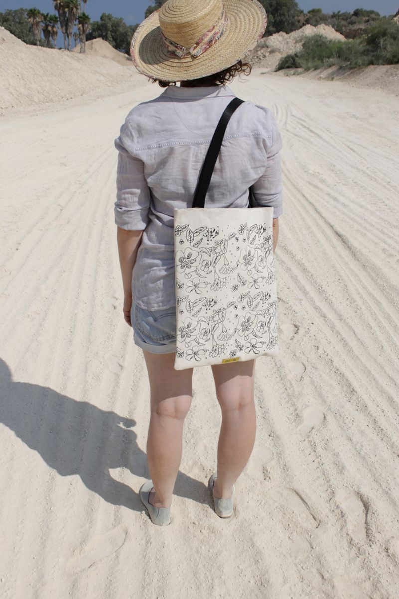 The tote bag is 12" x 15.3" (39cm x 31cm), straps are 69cm long.