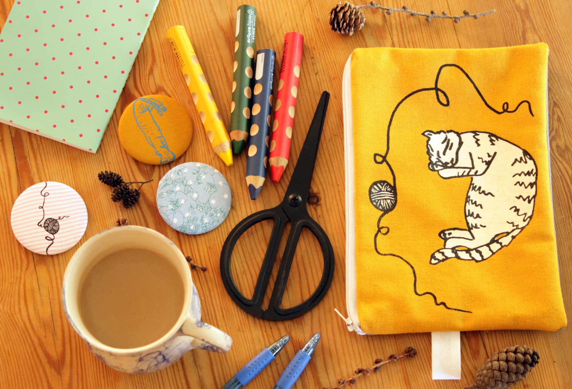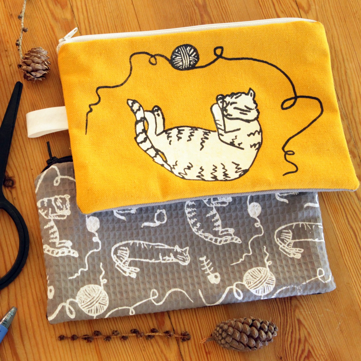 Made of mustard canvas with screen printed cat illustration in black and white.
